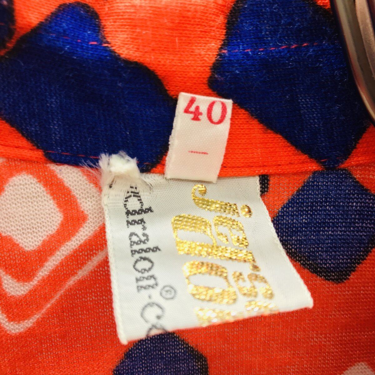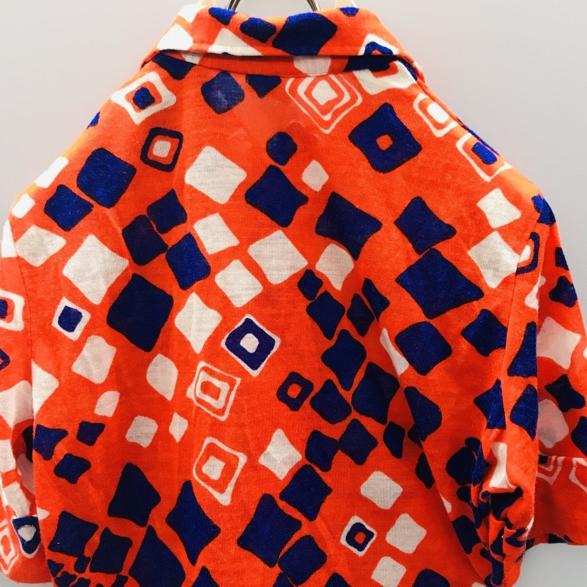 強烈オレンジ! ユーロ 70's ビンテージ 幾何学柄 袖折り返し 半袖ブラウス