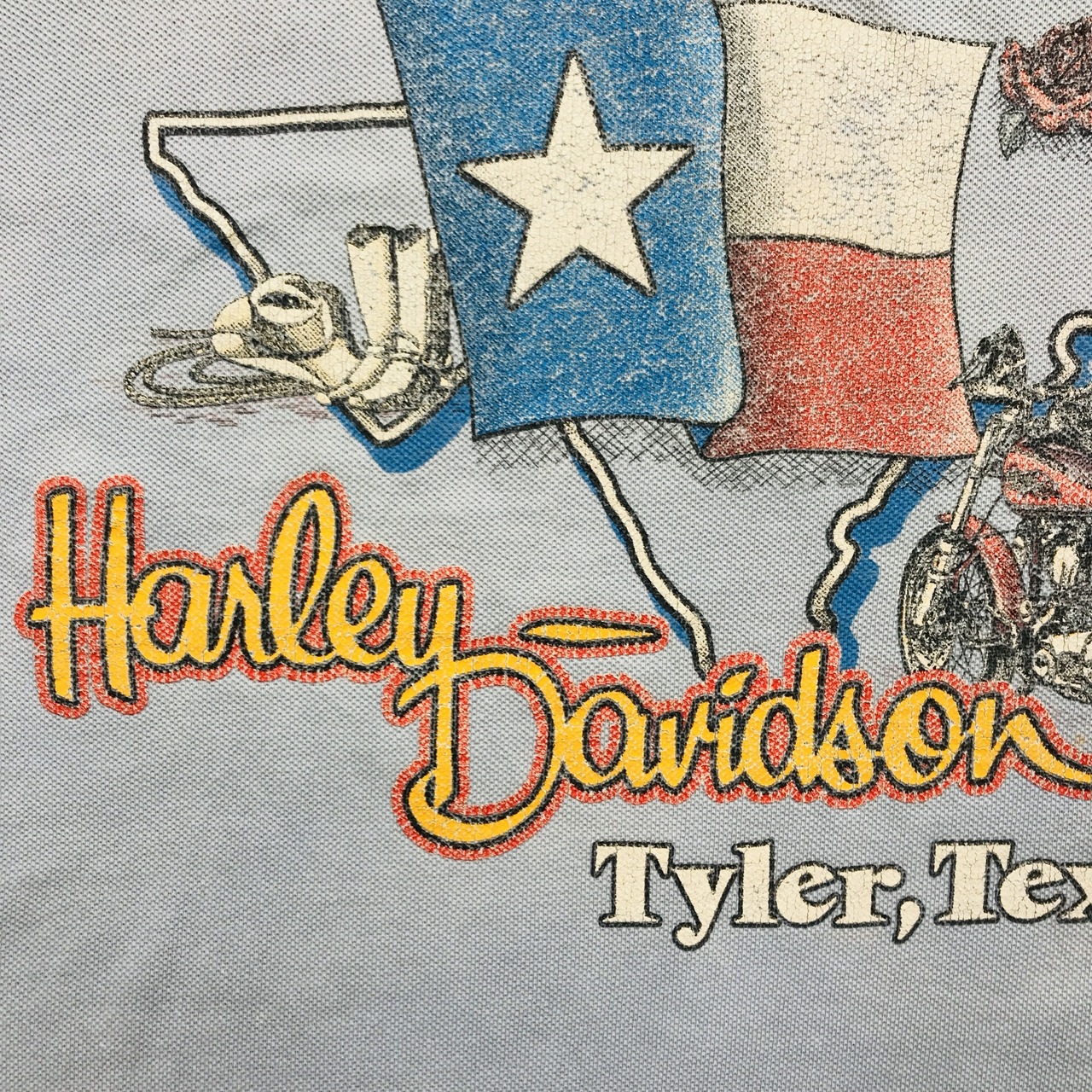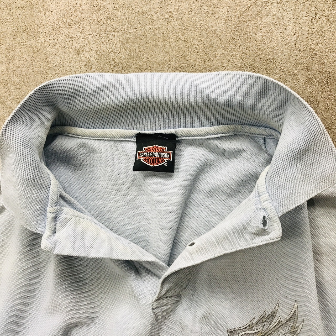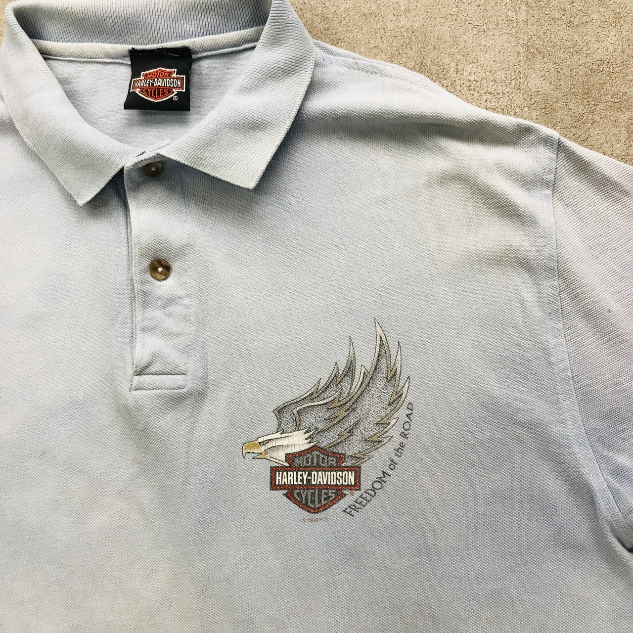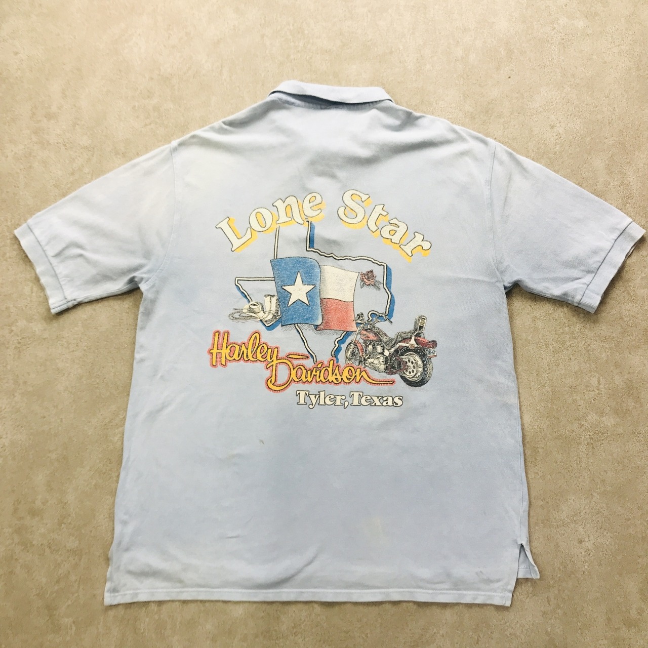 ダメージ ボロボロ・くたくた Harley-Davidson ハーレーダビッドソン ワンポイントロゴ バックプリント ポロシャツ ライトブルー テキサス・ロンスター