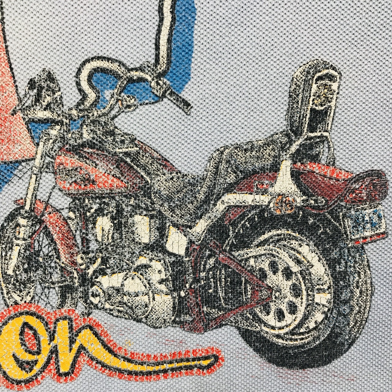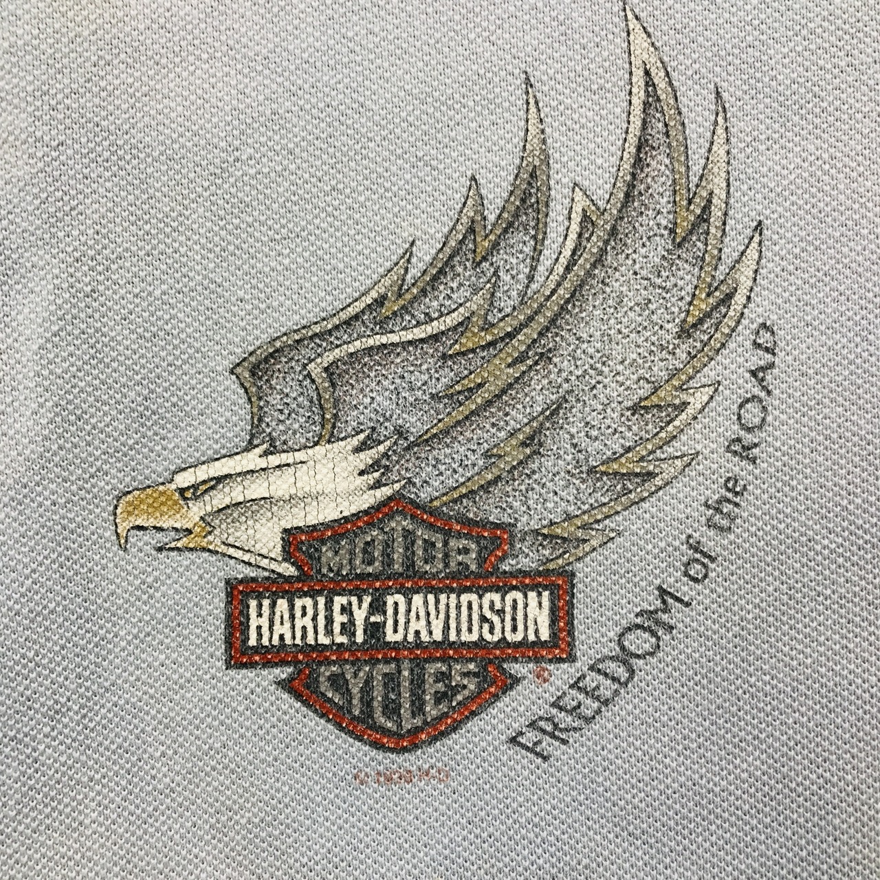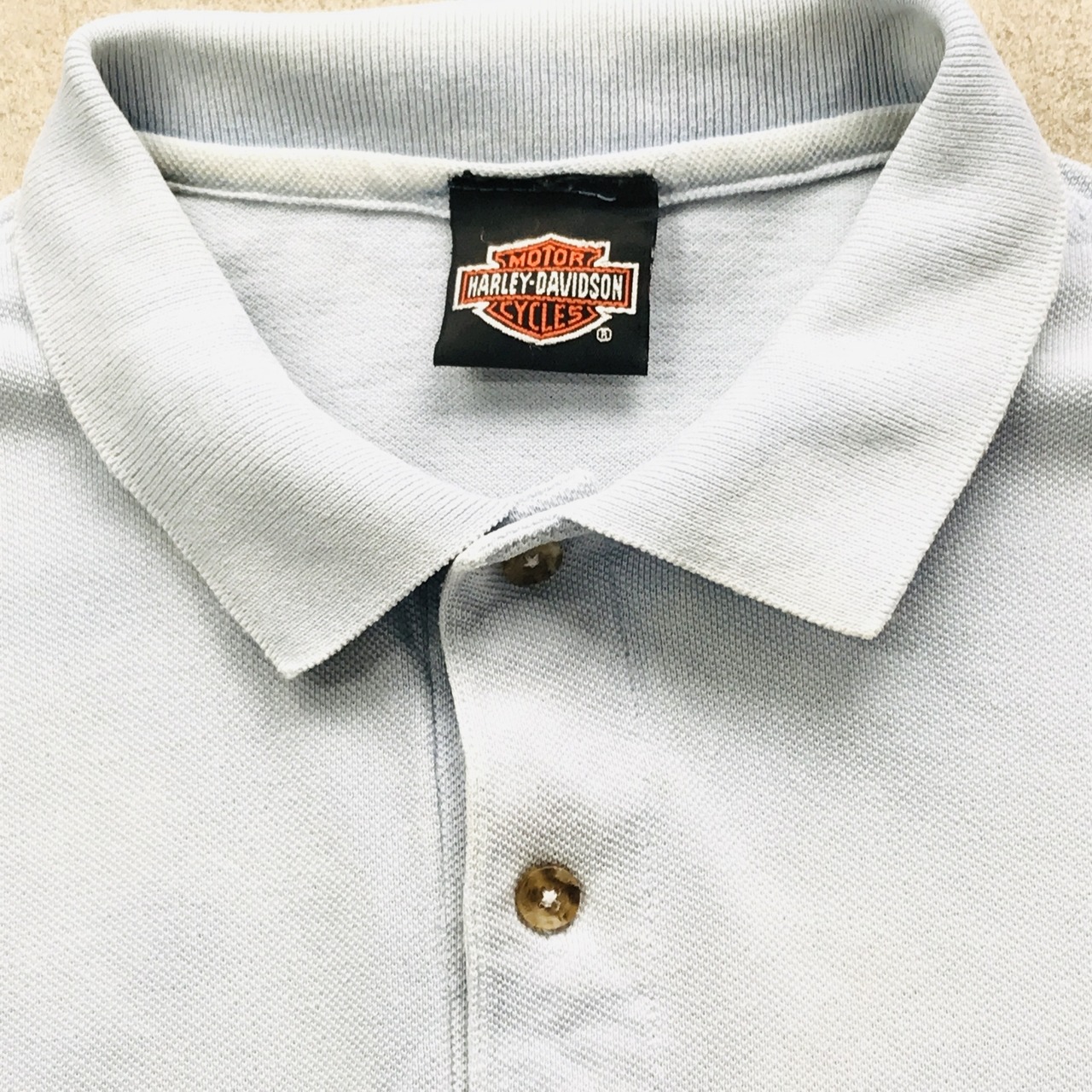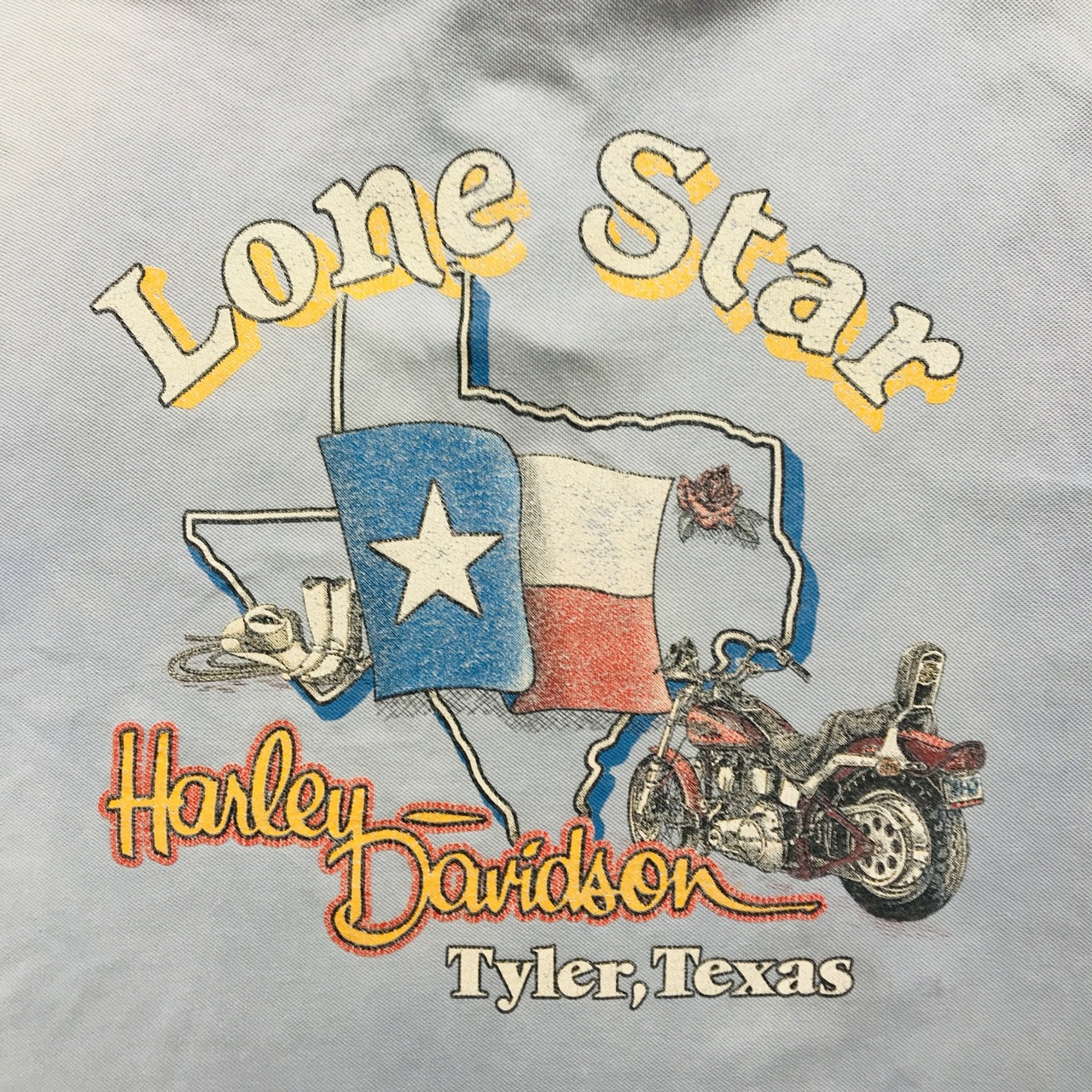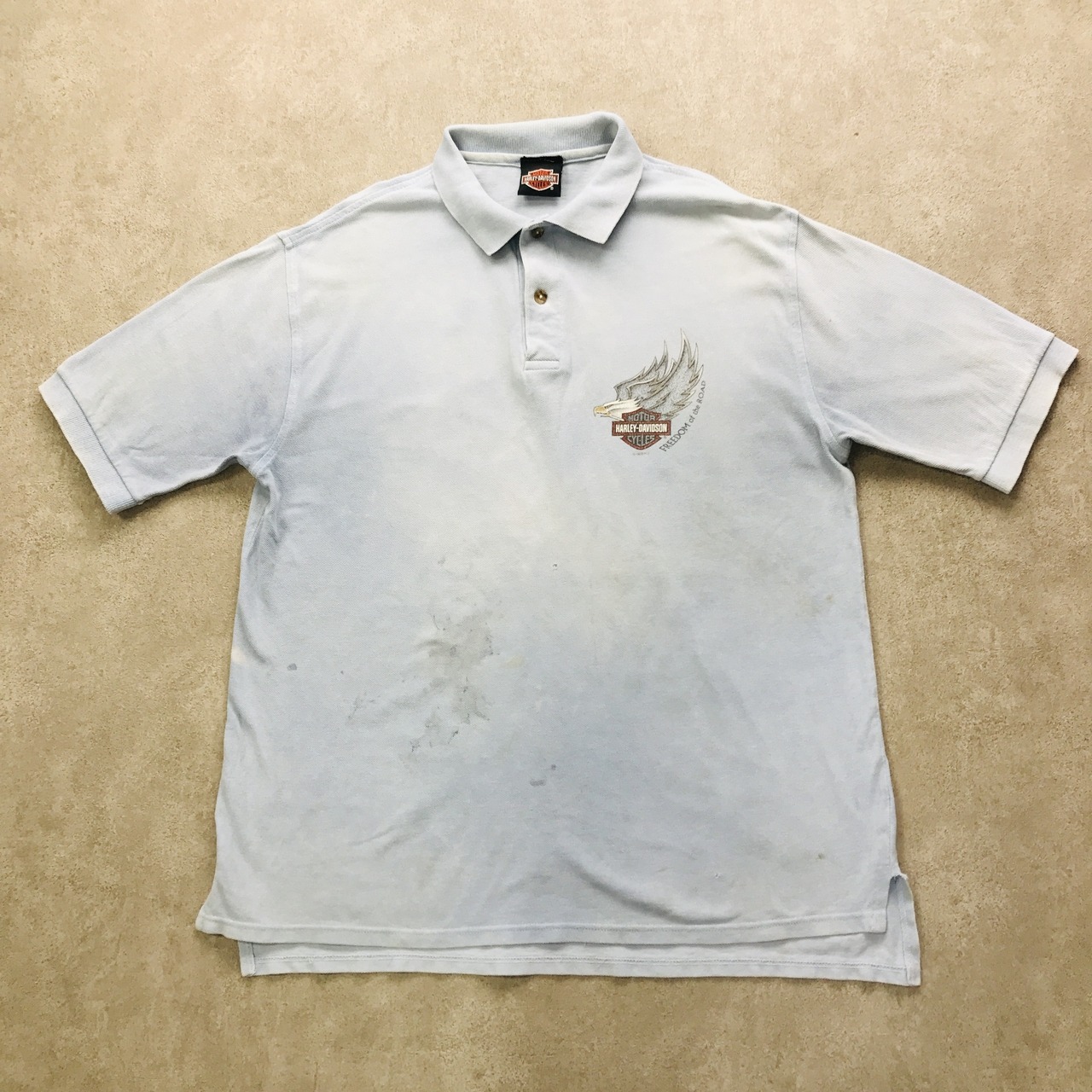 ダメージ ボロボロ・くたくた Harley-Davidson ハーレーダビッドソン ワンポイントロゴ バックプリント ポロシャツ ライトブルー テキサス・ロンスター