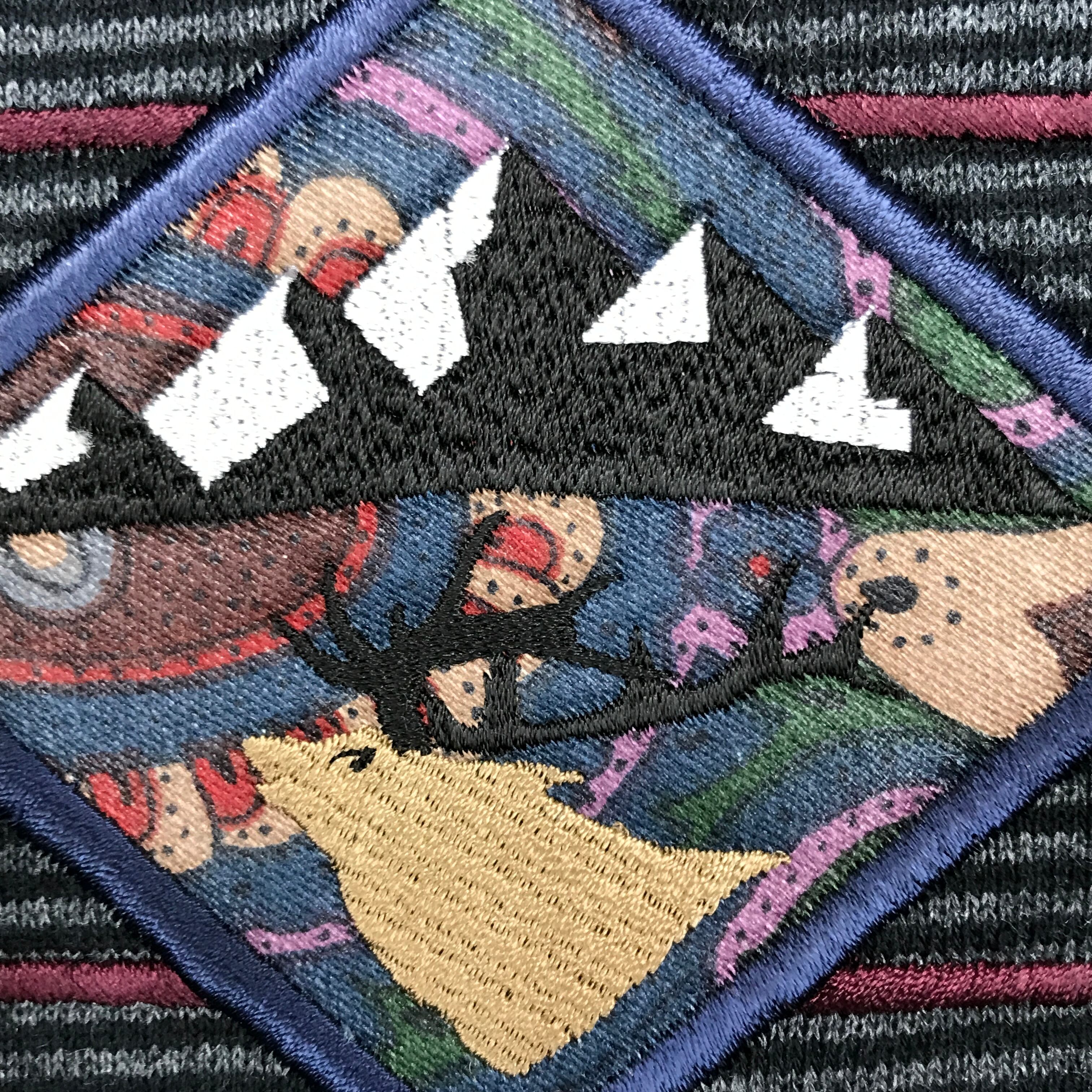 アップリケの生地に80'S調にデザインされたエルク、動物、山がしっかり