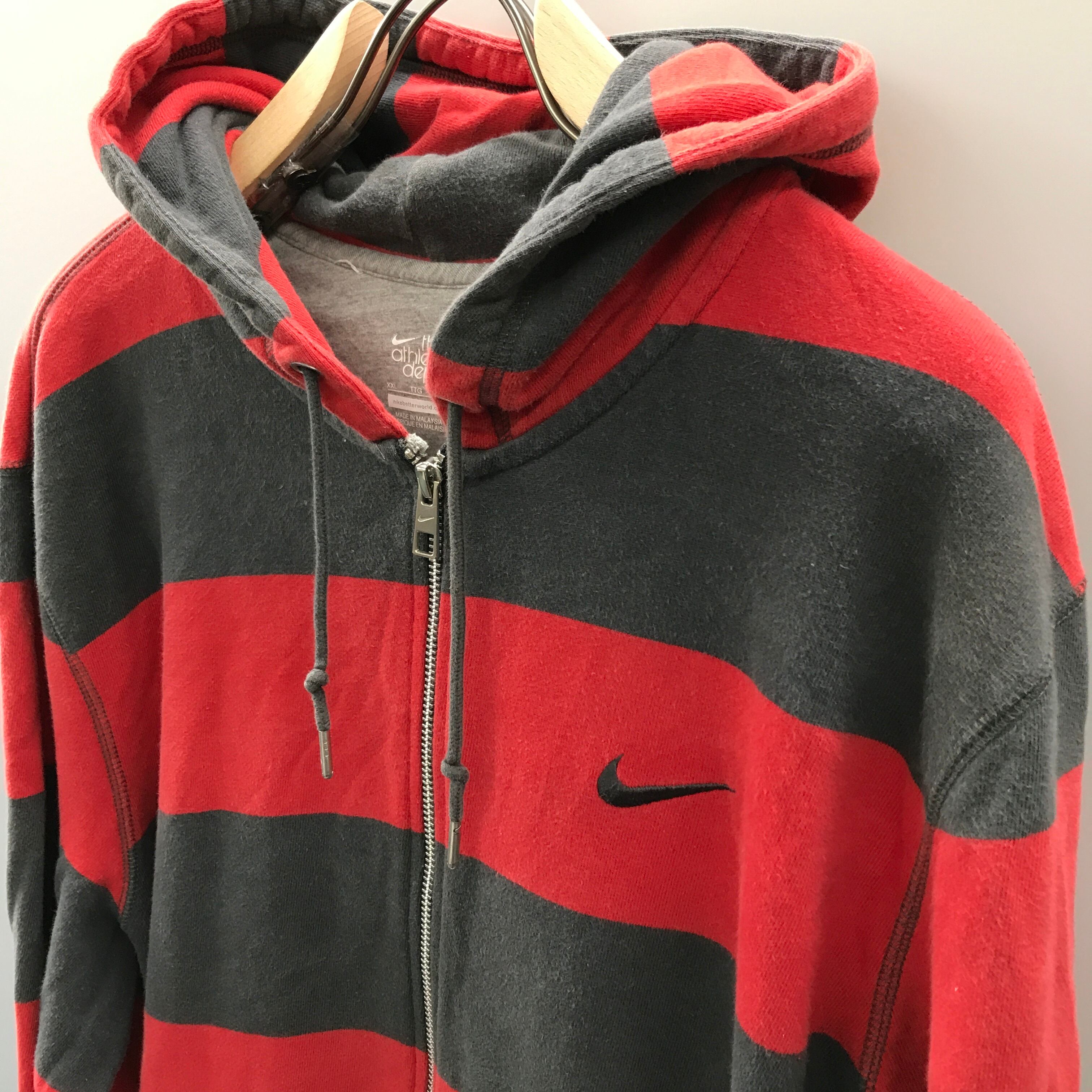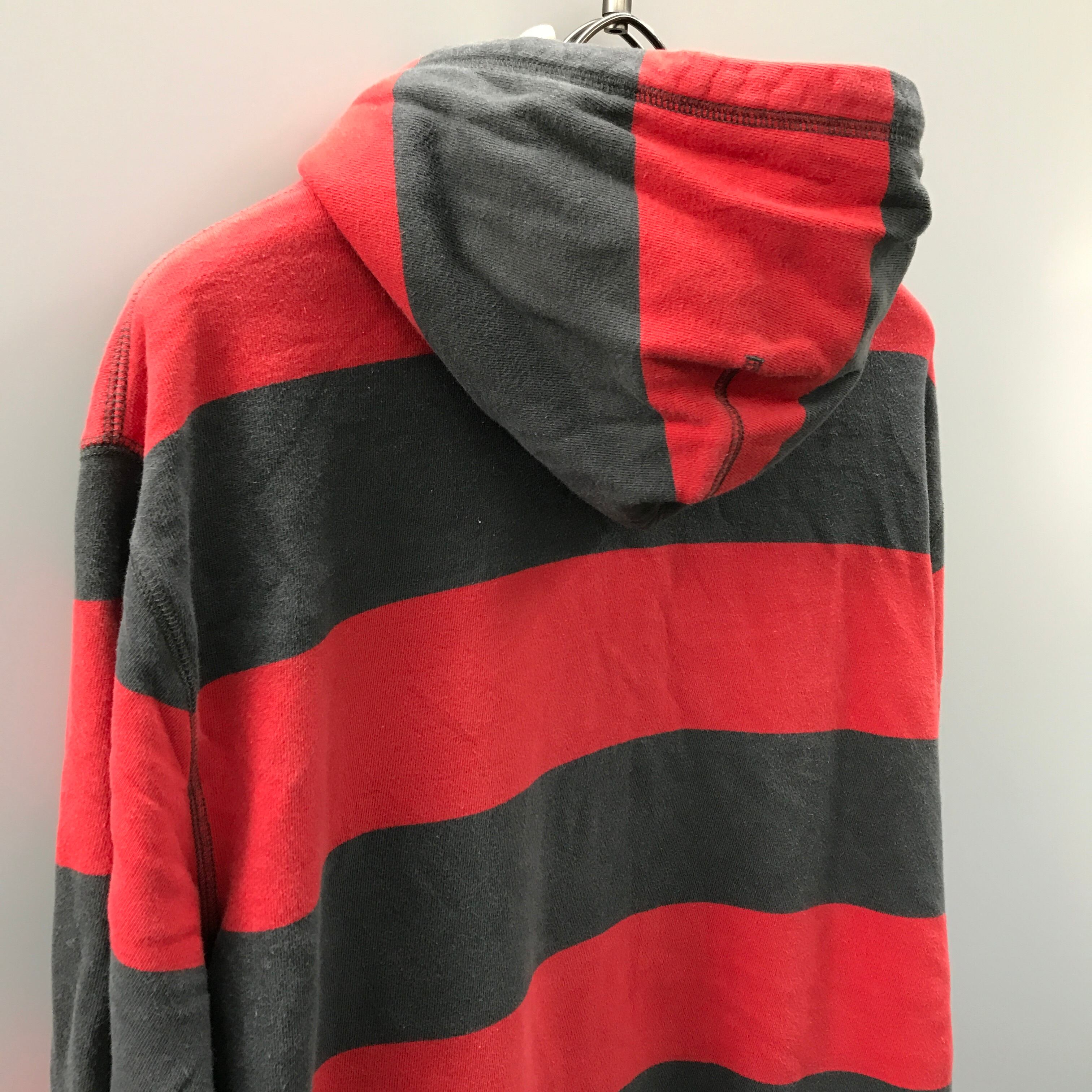 2000年以降のNIKEですが、NIKEっぽくないロック?パンク?なデザインが面白い。刺繍スウィッシュ(スウォッシュ)ロゴもいいですね。REDとグレーの太めのボーダーと色あせ感が90年代をイメージさせてくれます。中地はパイル地でサラっと着れそうです。カンガルーポケットの内側上部に穴があります。左の刺繍ロゴ横と左肩、左肘に薄汚れがあります。前面右柄のリブのキズあります。