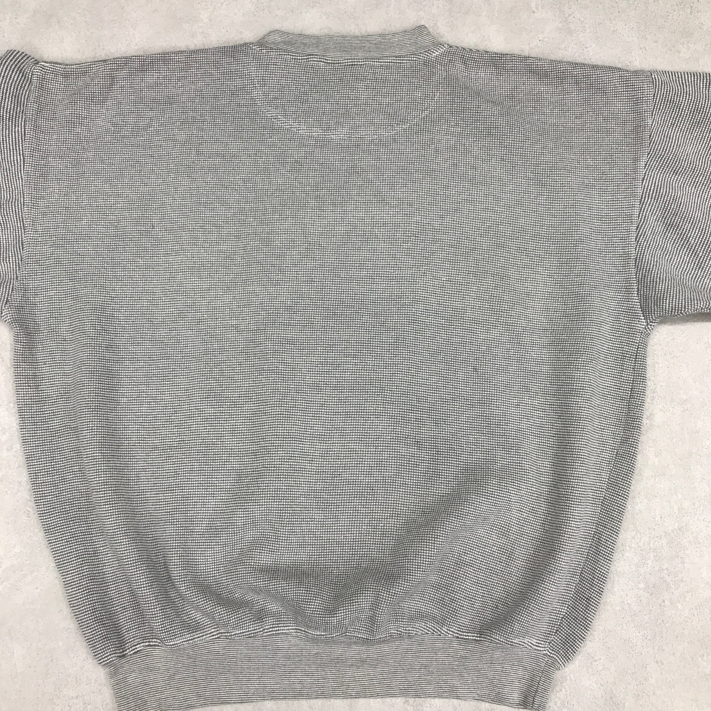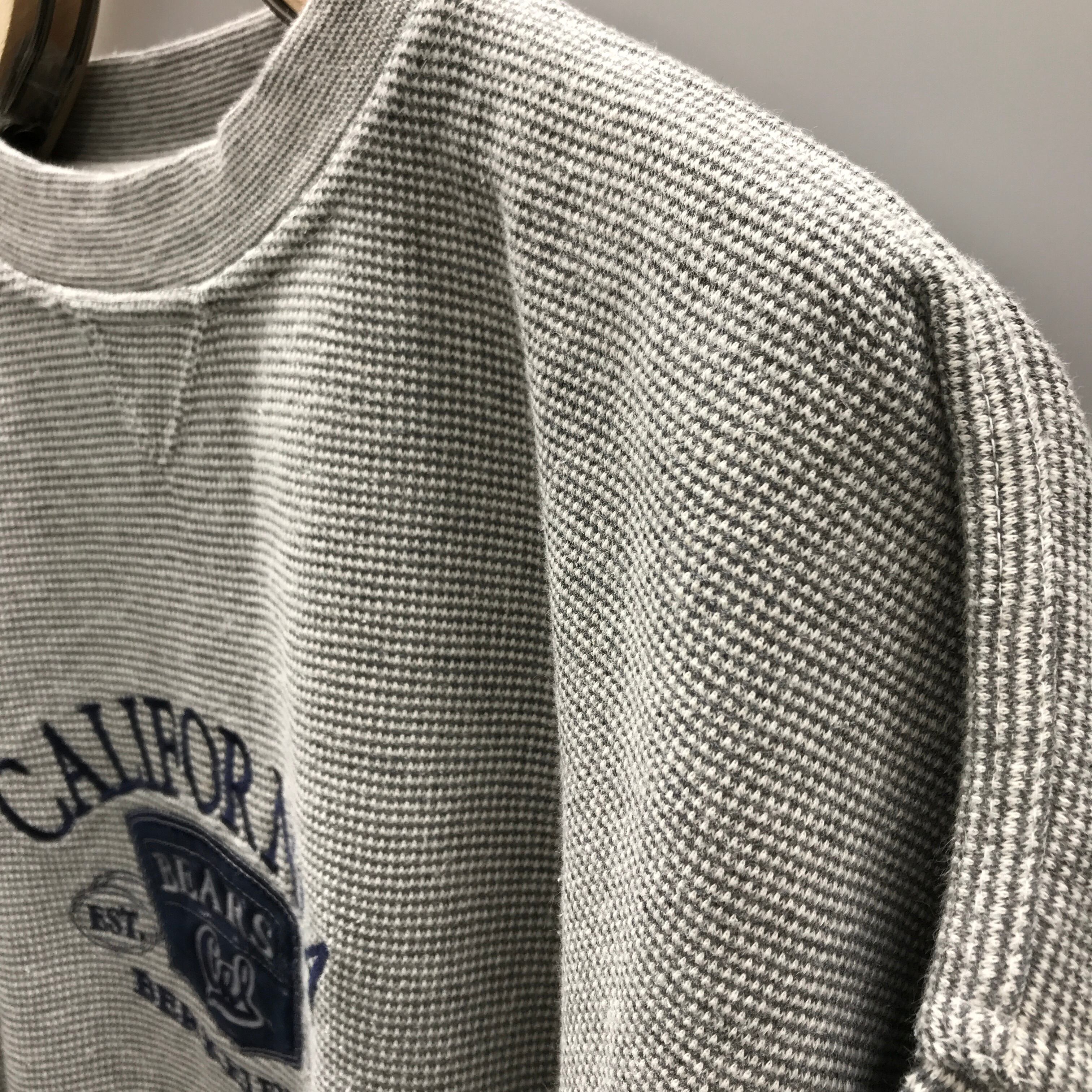 CRABLE SPORTSWEAR アメリカ規格の変わり種スウェットです。表地は白糸とグレーの糸を交互に編み込んでいます。真ん中に刺繍とワッペンで80〜90年代頃のカレッジスタイルを連想させてくれます。胸、腹部、左袖、右肘の辺りにシミ汚れが御座います。