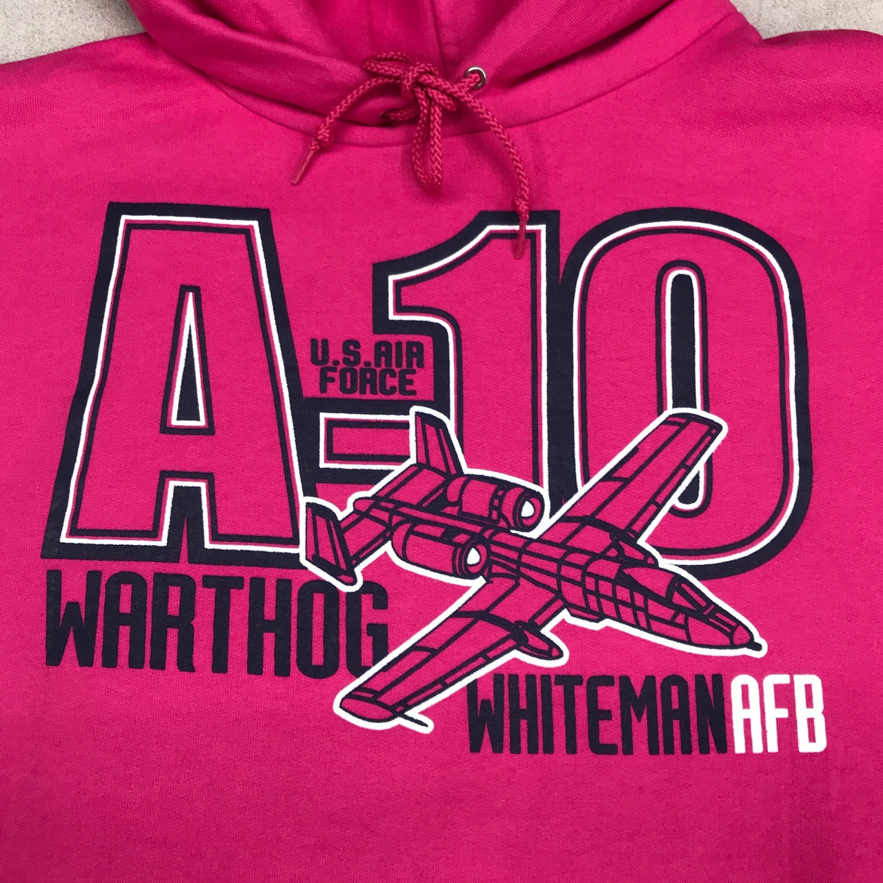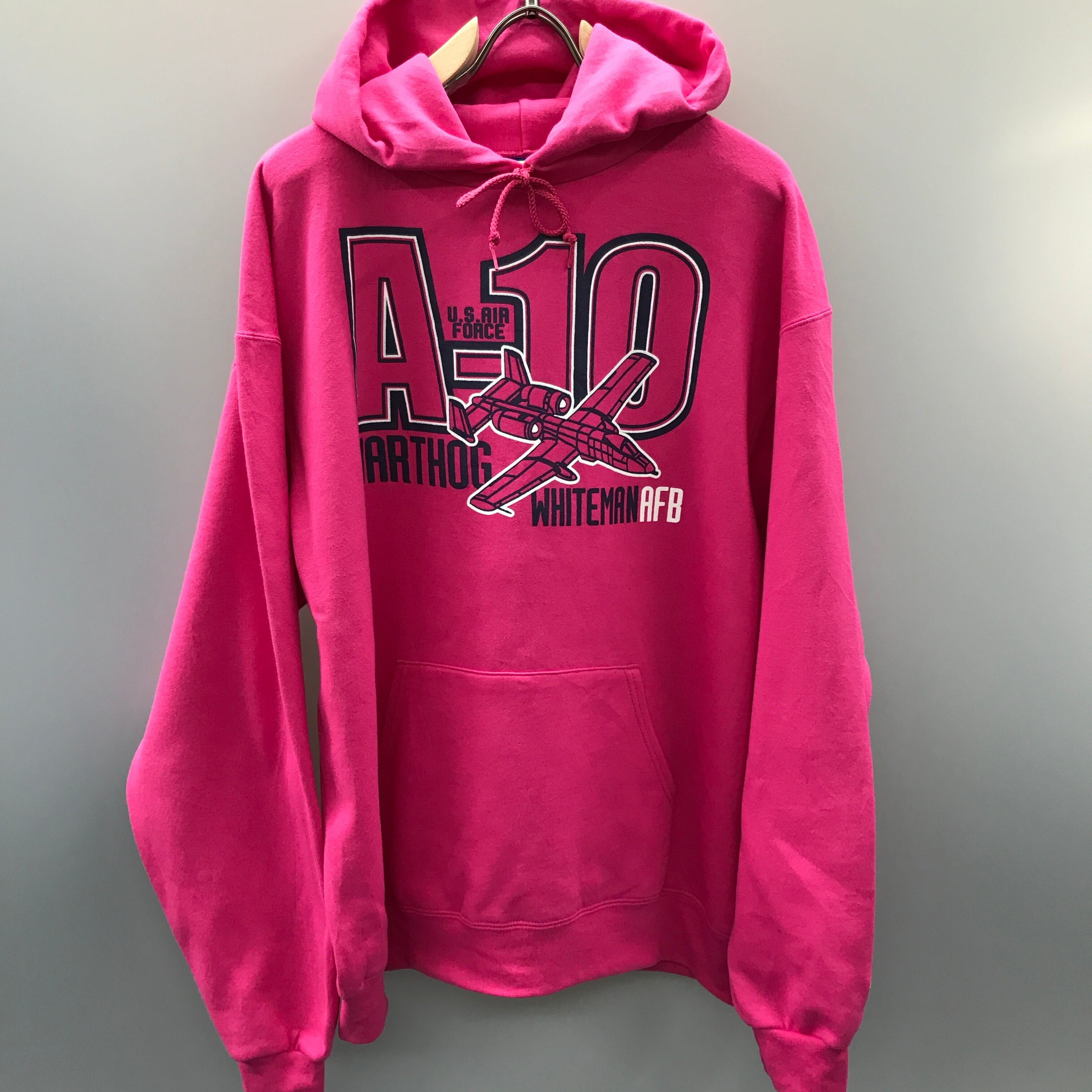 CHAMPION ECOのパーカーです。見てください鮮やかなピンク!そのピンクにA-10(U.S.AIR FORCE)プリントです。サイズもおおきくギャップがすごい!着用感も感じない程度の状態です。汚れやキズも見受けられません。