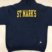 USA製ラッセルのカレッジプリントパーカーです。ST.MARK'S(セント・マークス)のプリントがいい感じにひび割れています。両袖に破れ、左袖に汚れが有ります。中地の起毛も着用感があり毛玉がます。