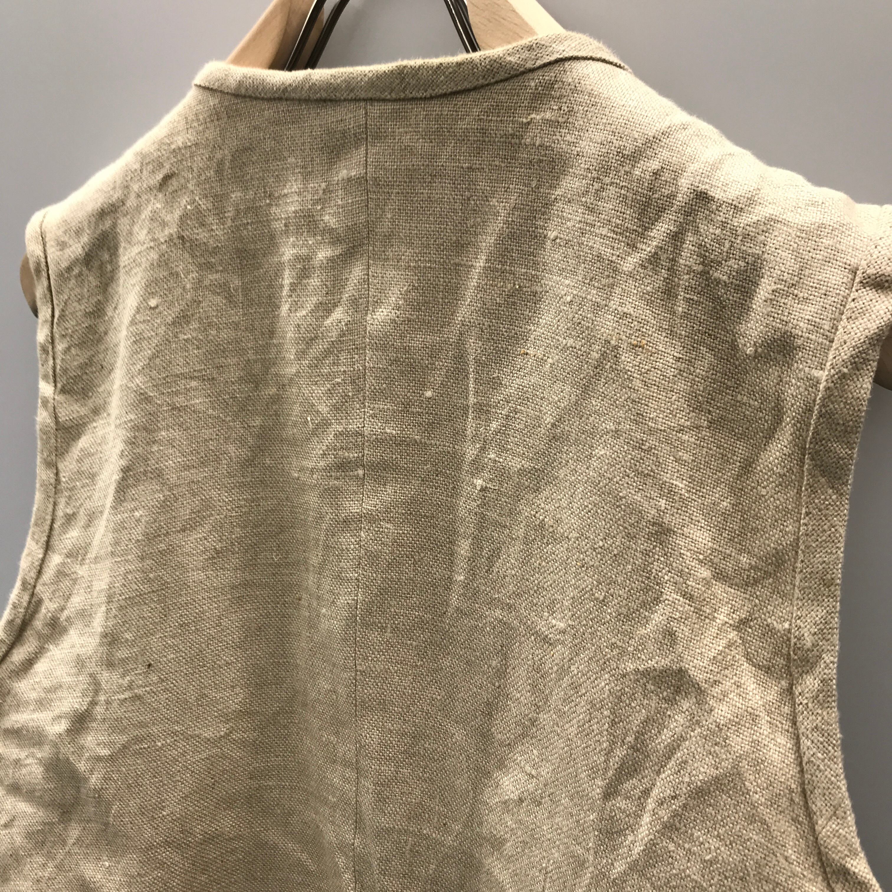 ハンドクラフトユーロベストです。リネンのパッチワークに刺繍や装飾が施されています。中地はレーヨン100%です。薄汚れは多少あります。中地も小穴があいてます。タグの雰囲気的に80〜90年代頃です。ユーロならではのセンスの良さが際立っています。