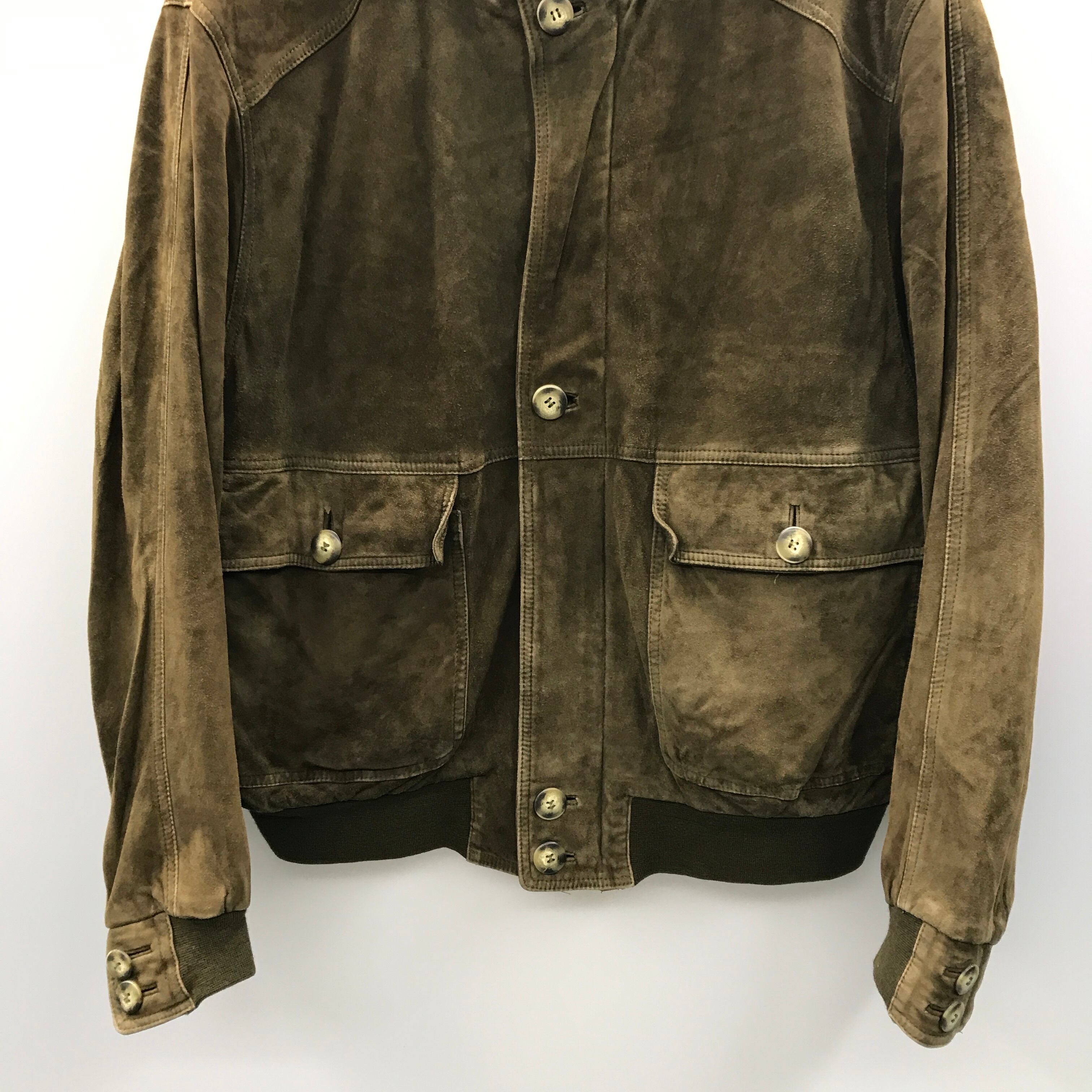 ユーロ圏のスウェードレザージャケットです。ECHTES leatherとはドイツ語で本革という意味で、Genuine leatherは革のグレードです。柔らかく加工がしやすいのが特徴です。スウェード特有の匂いやキズ、右肩にうす汚れあります。イタミは見受けられませんが、内ポケットの中に破れの補修があります。肩に薄めのパッドが入っています。ボタンの縫い糸がゆるくなっている個所もあります。スウェードのボンバージャケットは気になるところです。