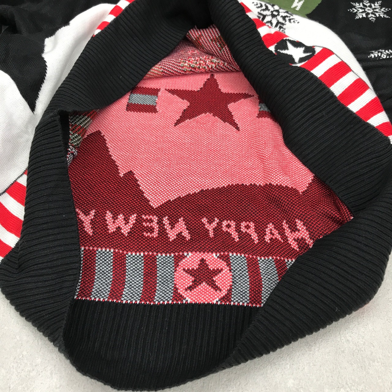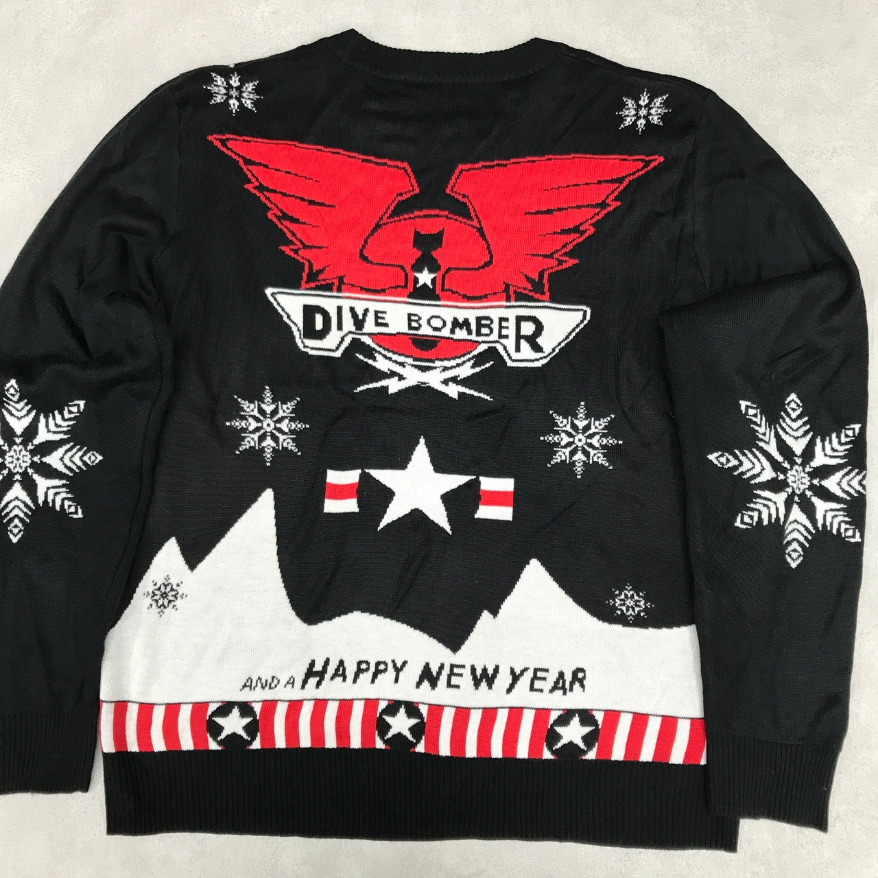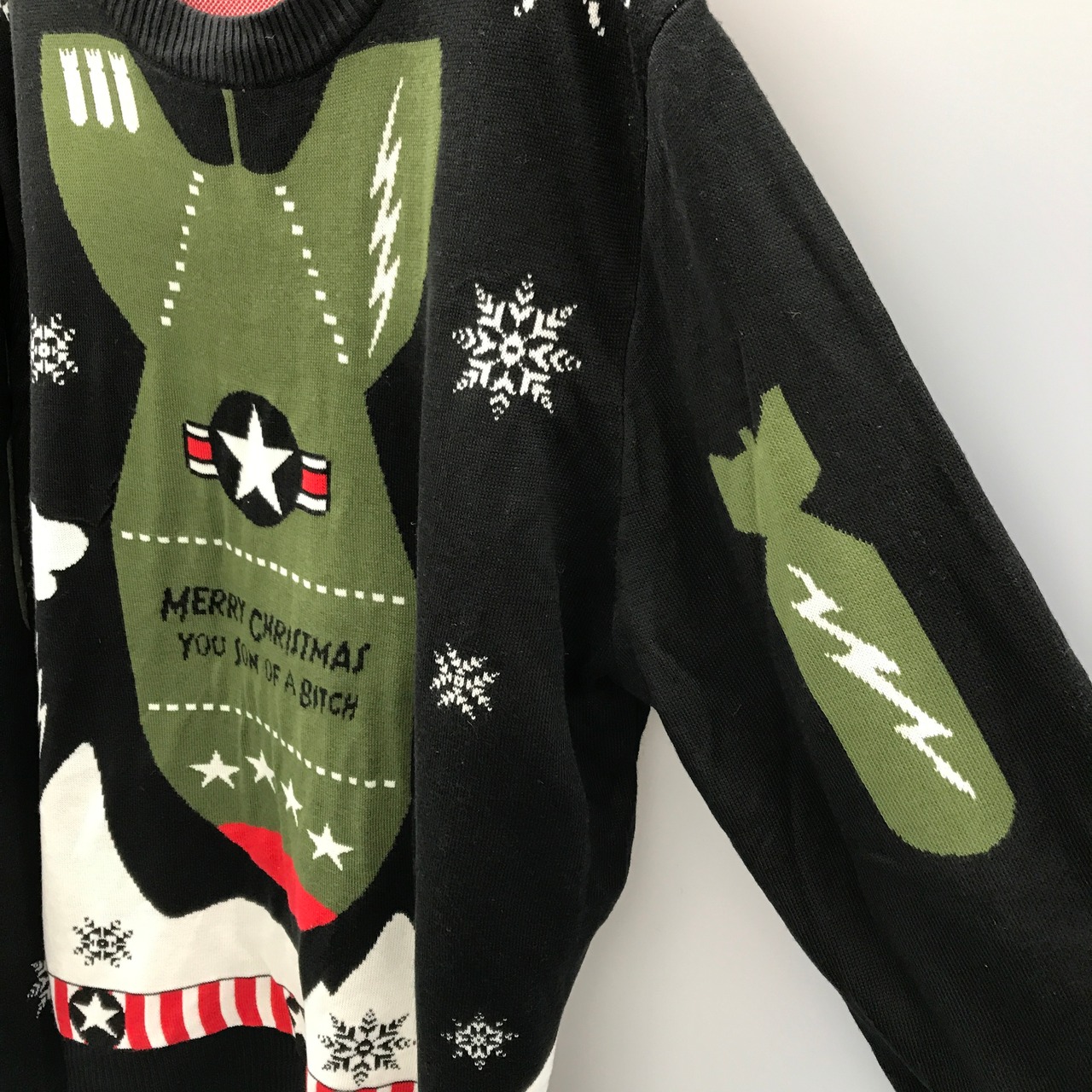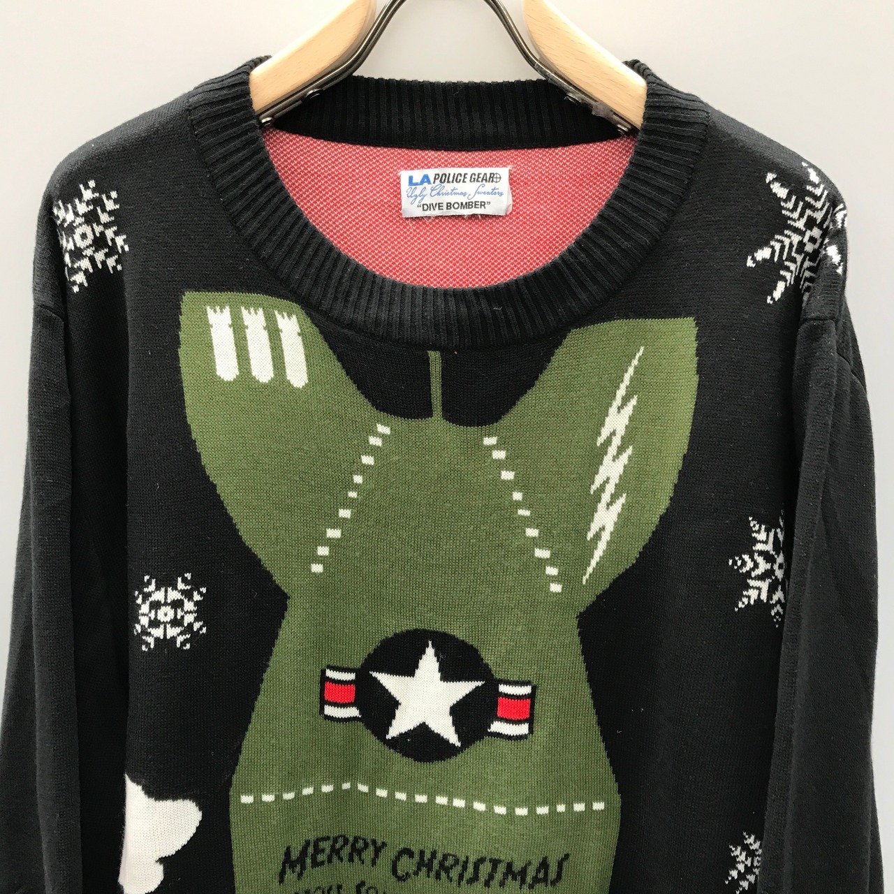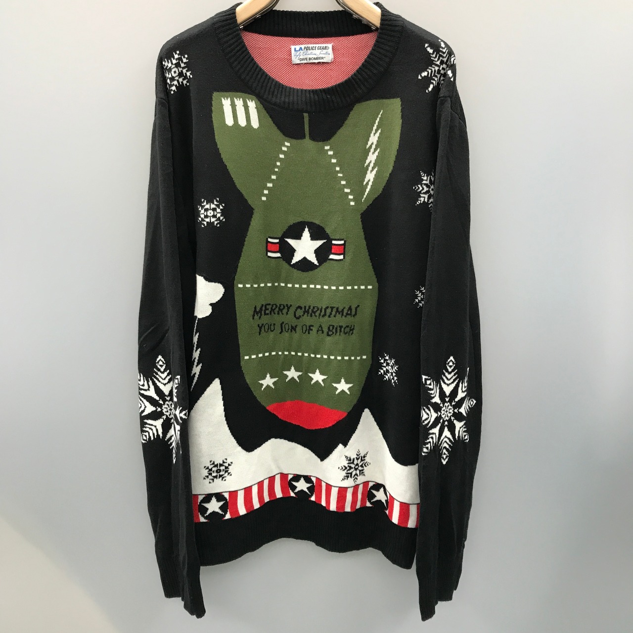 「MERRY CHRISTMAS YOU SON OF A BITCH AND A HAPPY NEW YEAR」DIVE BOMBER 爆弾?ミサイル?ノルディック?意味深なセーターです。生地はアクリルかと思います。手触りは2枚合わせでもちもちしています。背中の左側に補修跡があります。サイズは不明ですがゆったりサイズです。