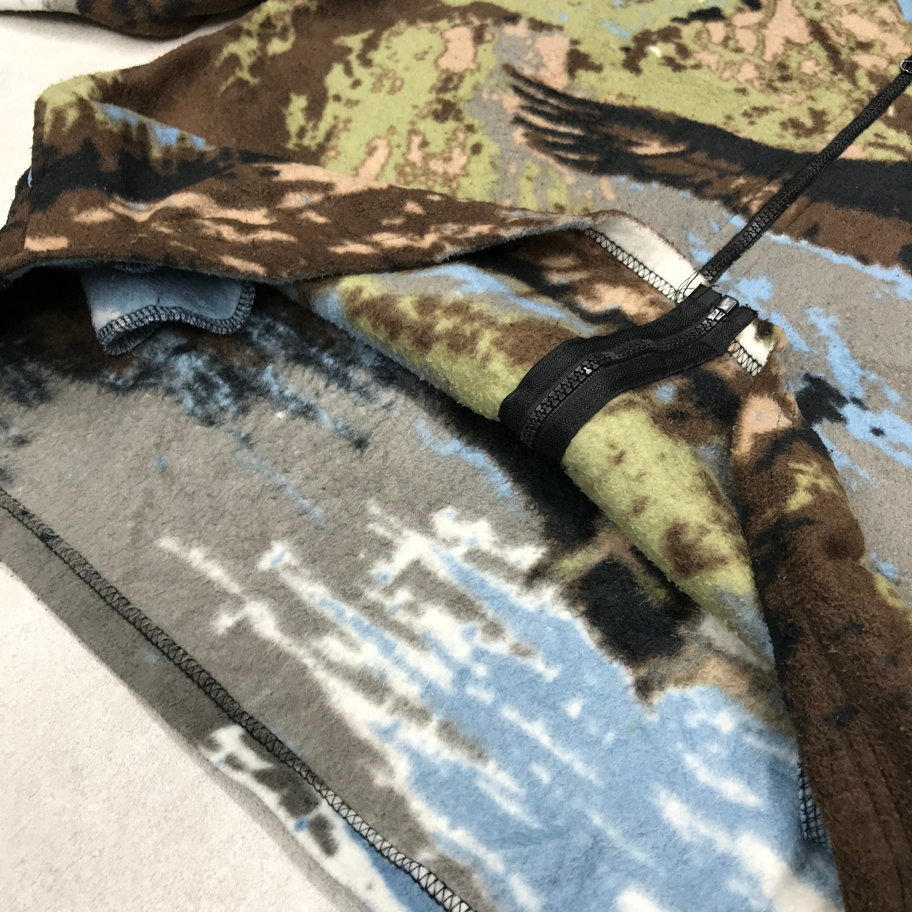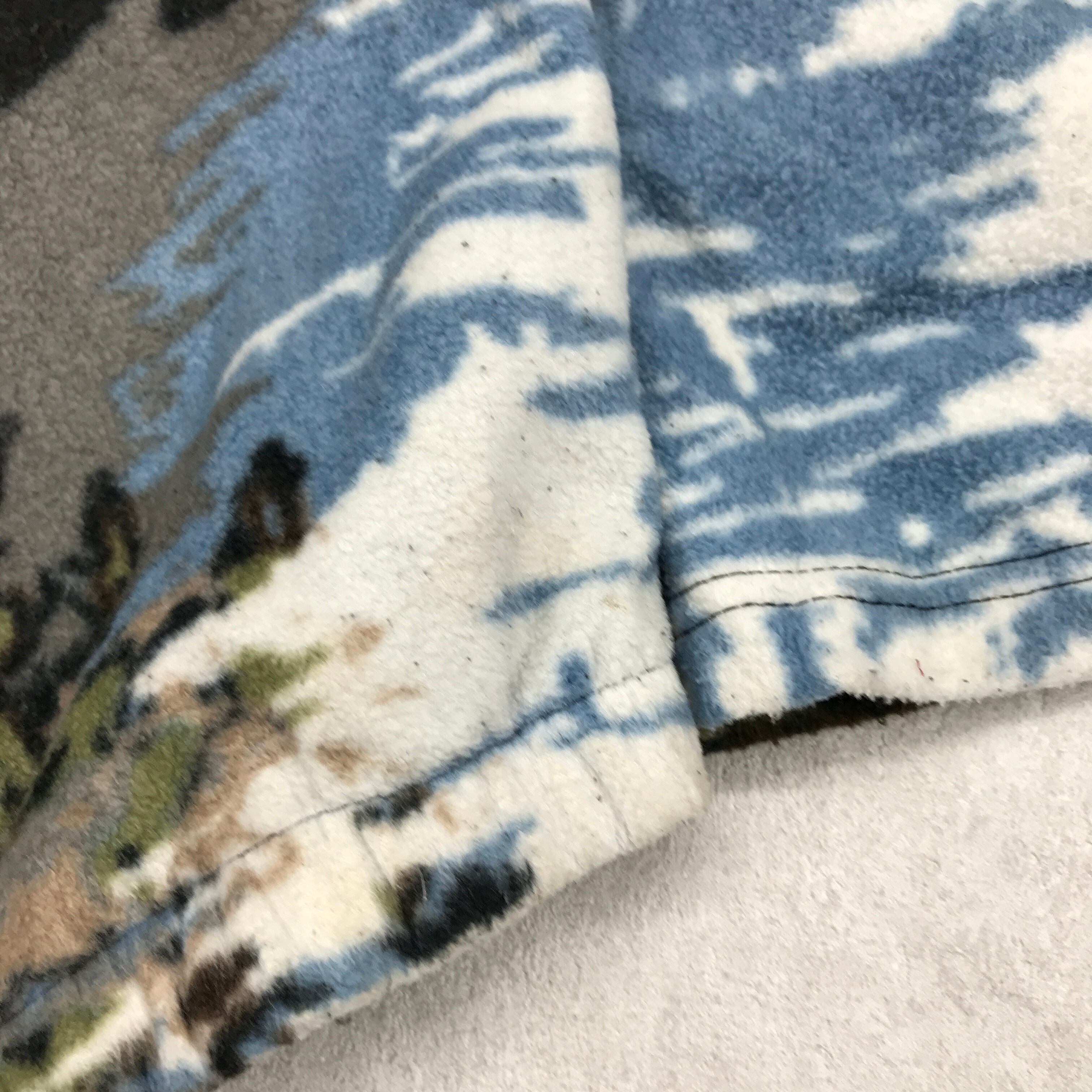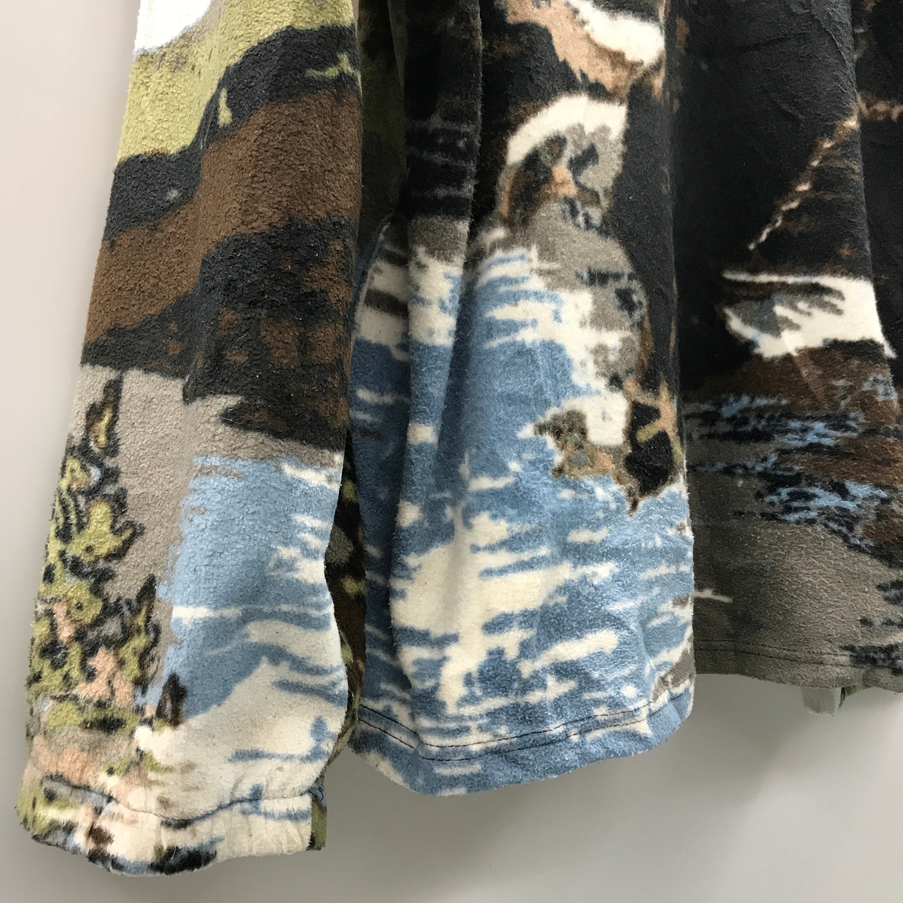 壮大な大自然にイーグル(鷲)のデザインが素敵です。アウトドアやストリートにも使えそうです。全体的に着用感があり、袖や襟、スソなど小さな毛玉がついてます。左肩にブルーの着色汚れが有ります。穴などは見受けられません。袖のリブゴムは伸びてます。古着ならではのデザインかとおもいます。