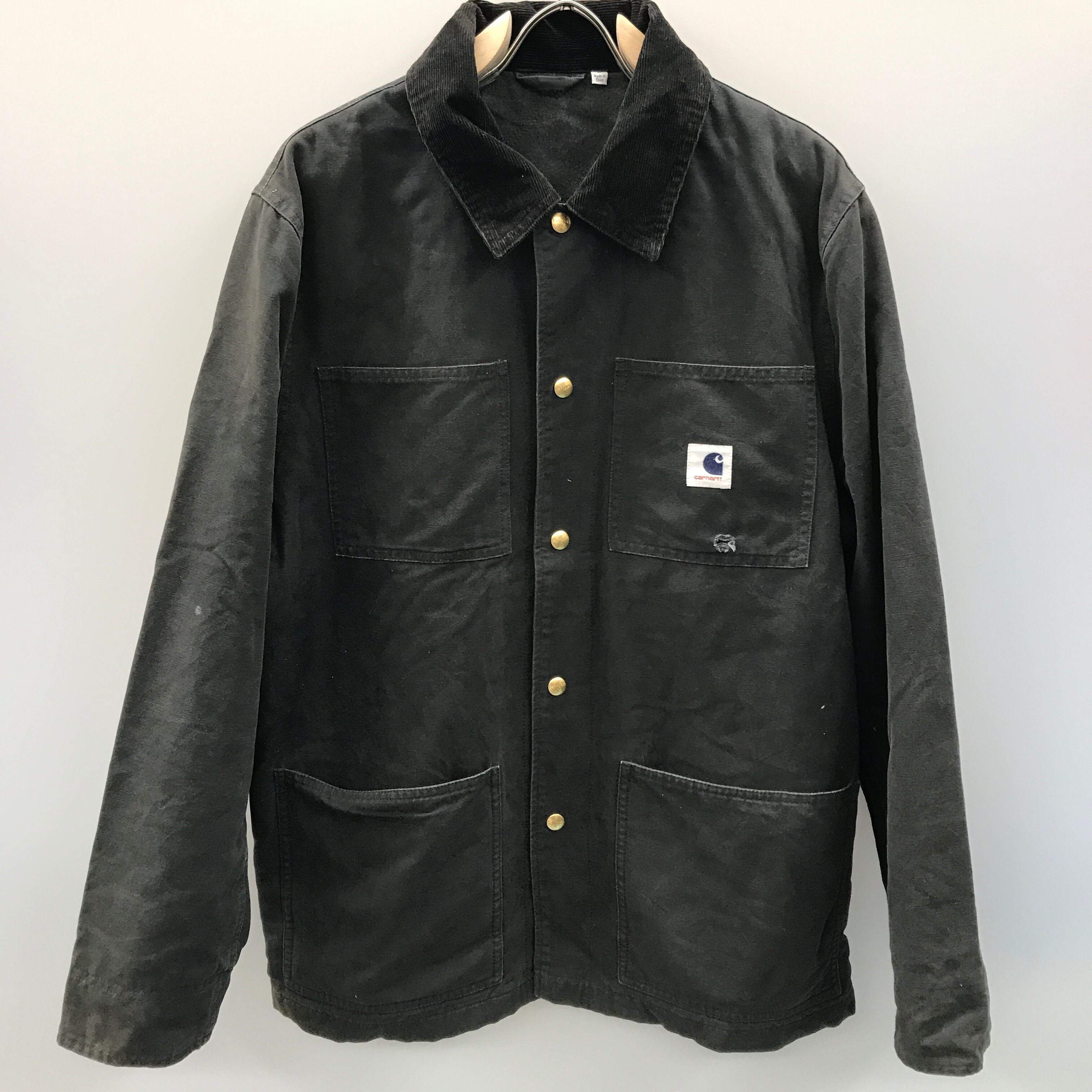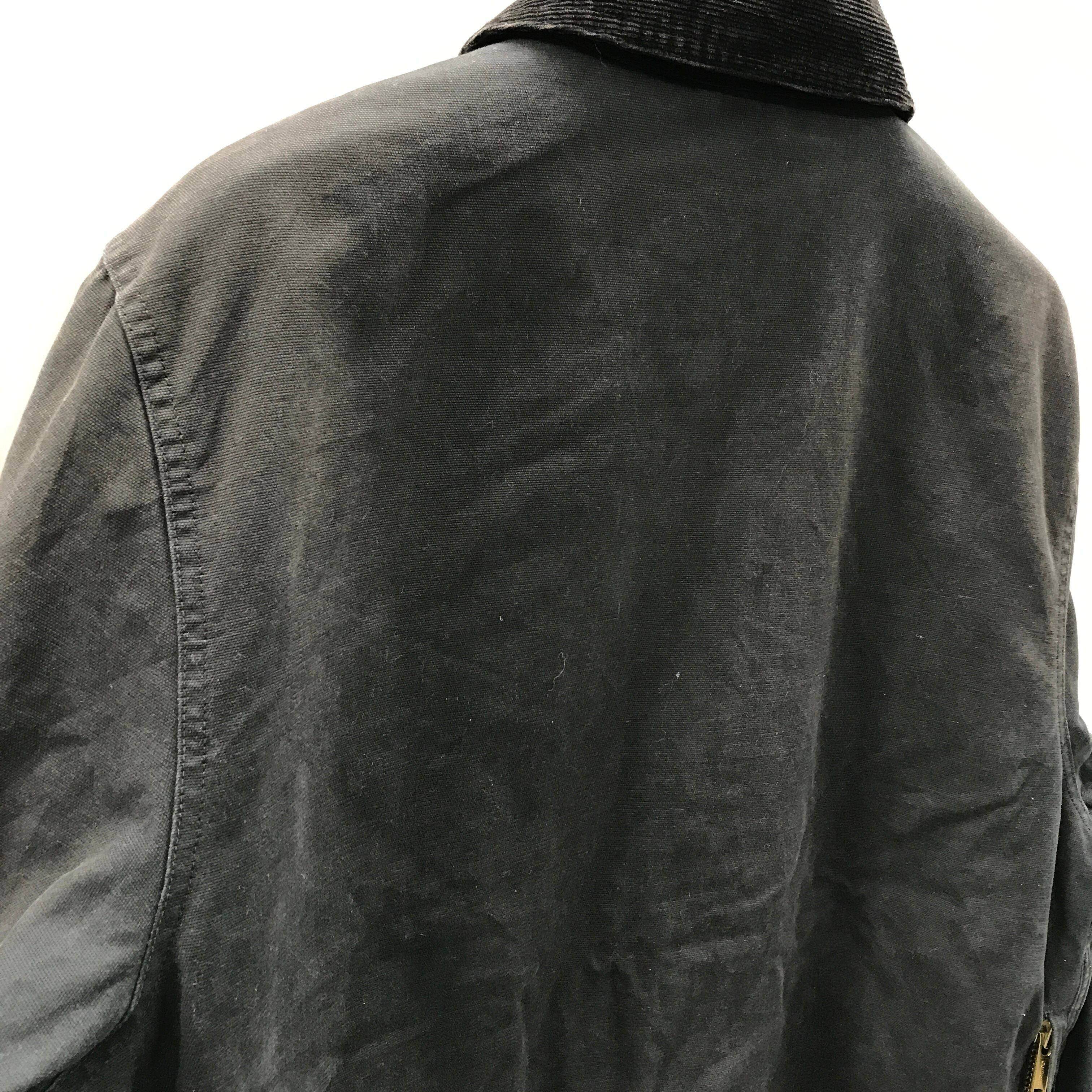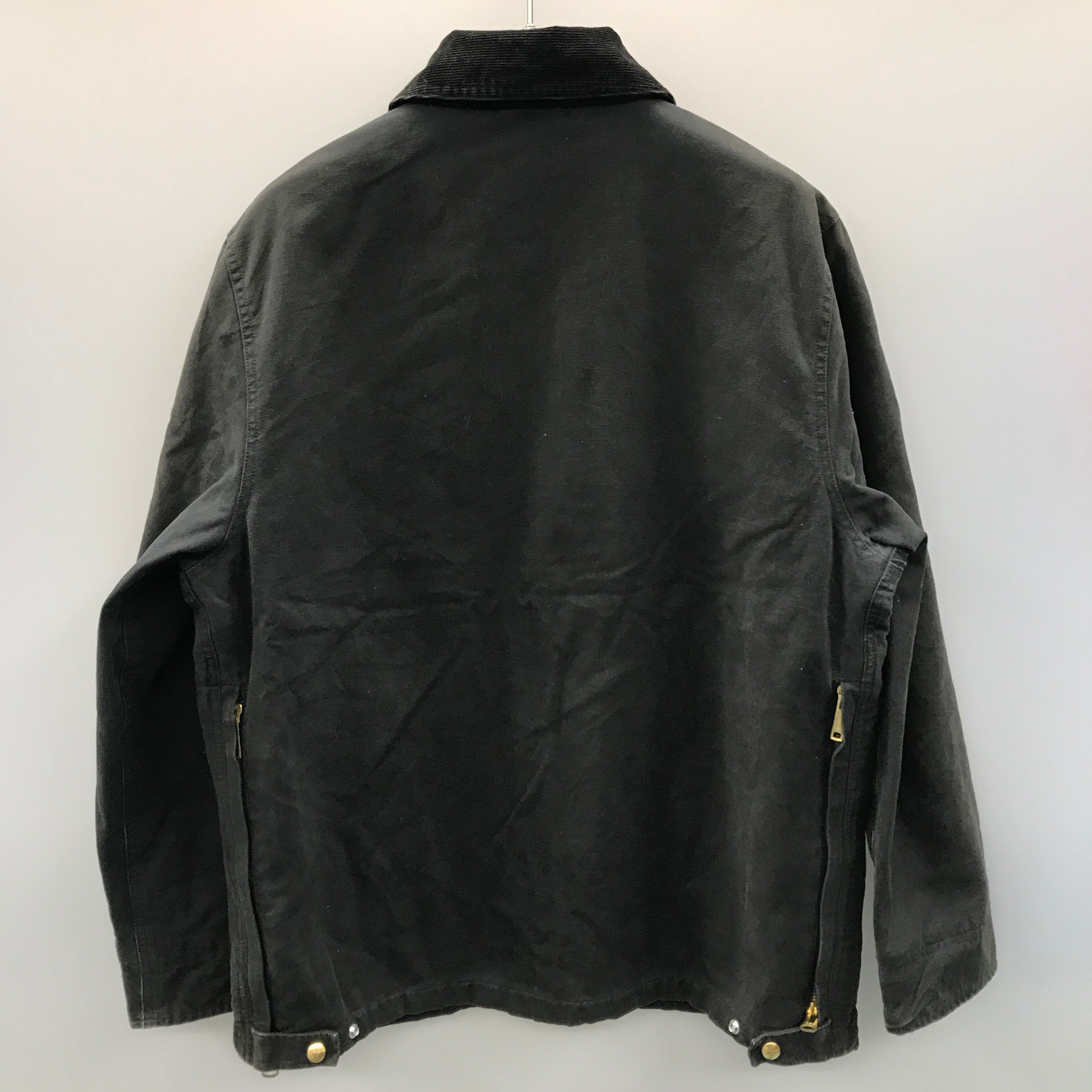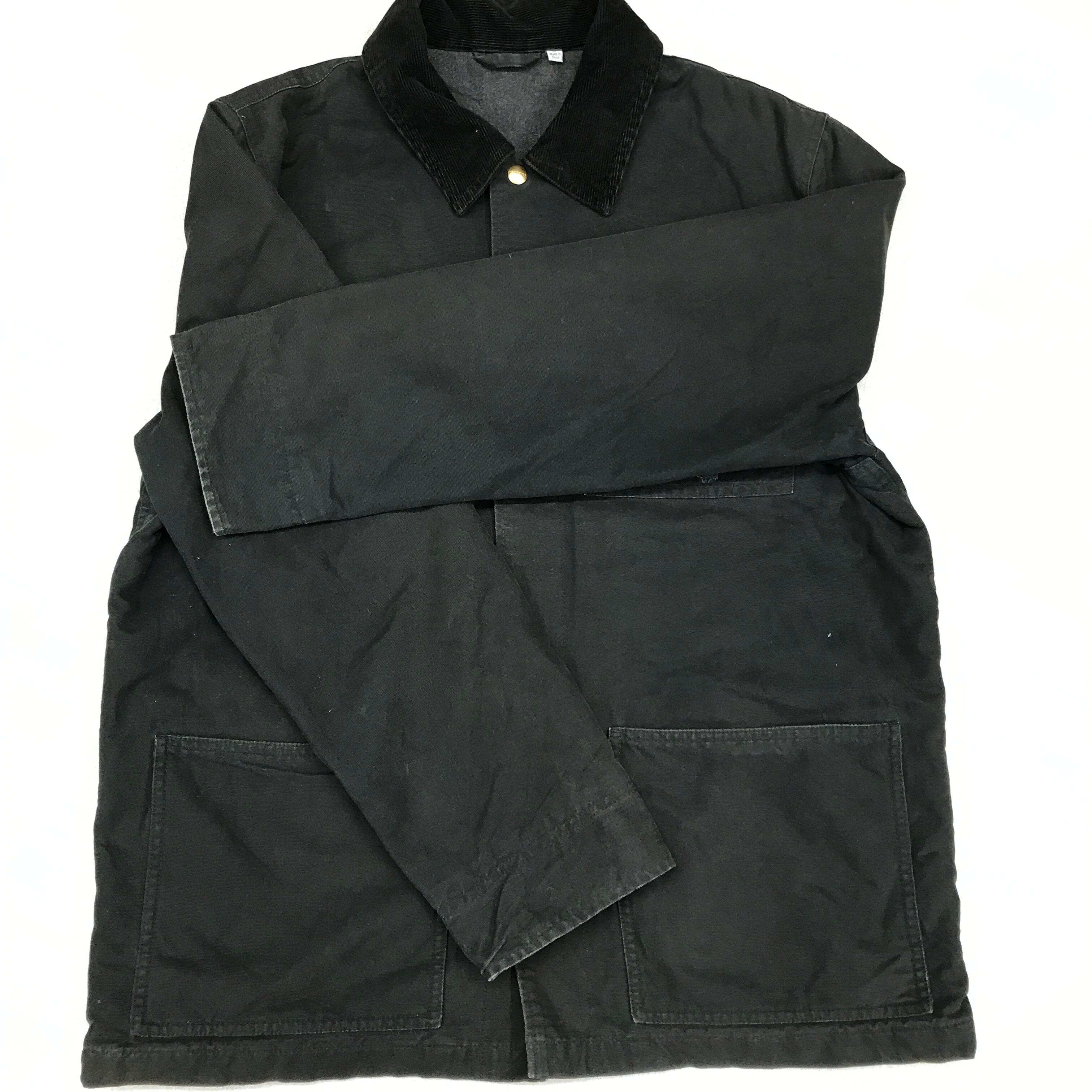 アダムキメルとカーハートのダブルネームです。カーハート定番のダック地のレイルマンジャケットをタイトにスタイリッシュにしたシルエットです。中地はポリエステルで薄手のキルティングとなり、保温性はあるけどゴワゴワしにくいです。全体的に着用感あり、白っぽく洗い晒しのダック地で擦れやすい袖やスソなどアタリがでています。胸ポケットには穴が開いています。お色が黒の為汚れは目立ちにくいですが有ります。両脇下にジッパーが採用されています。