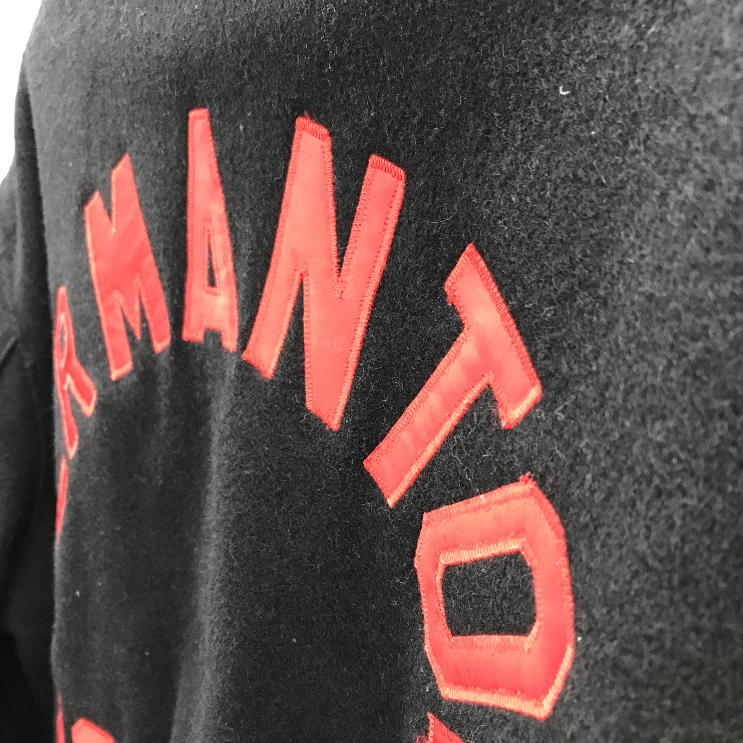 80年代USA製ウールメルトン地のスタジアムジャンパーです。背中に「GERMANTOWN ACADEMY」アップリケです。メルトンウールがビンテージ感があり渋いです。着用感と毛玉が少々あります。両袖のリブに汚れがあります。他目立つ汚れなど見受けられません。ナイロンキルティングの中地とポリの綿が入っていますが、そのわりに軽いです。