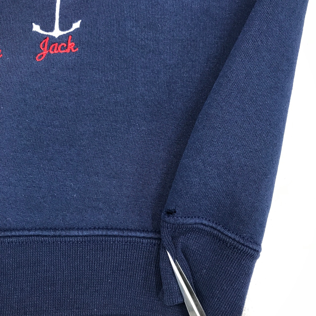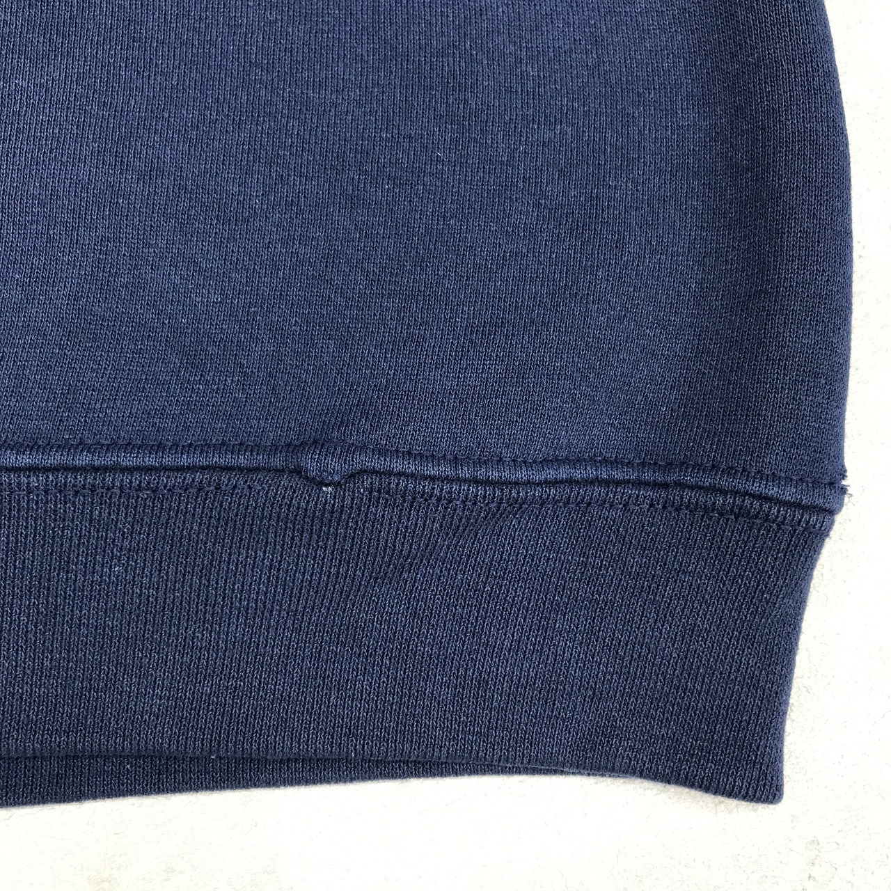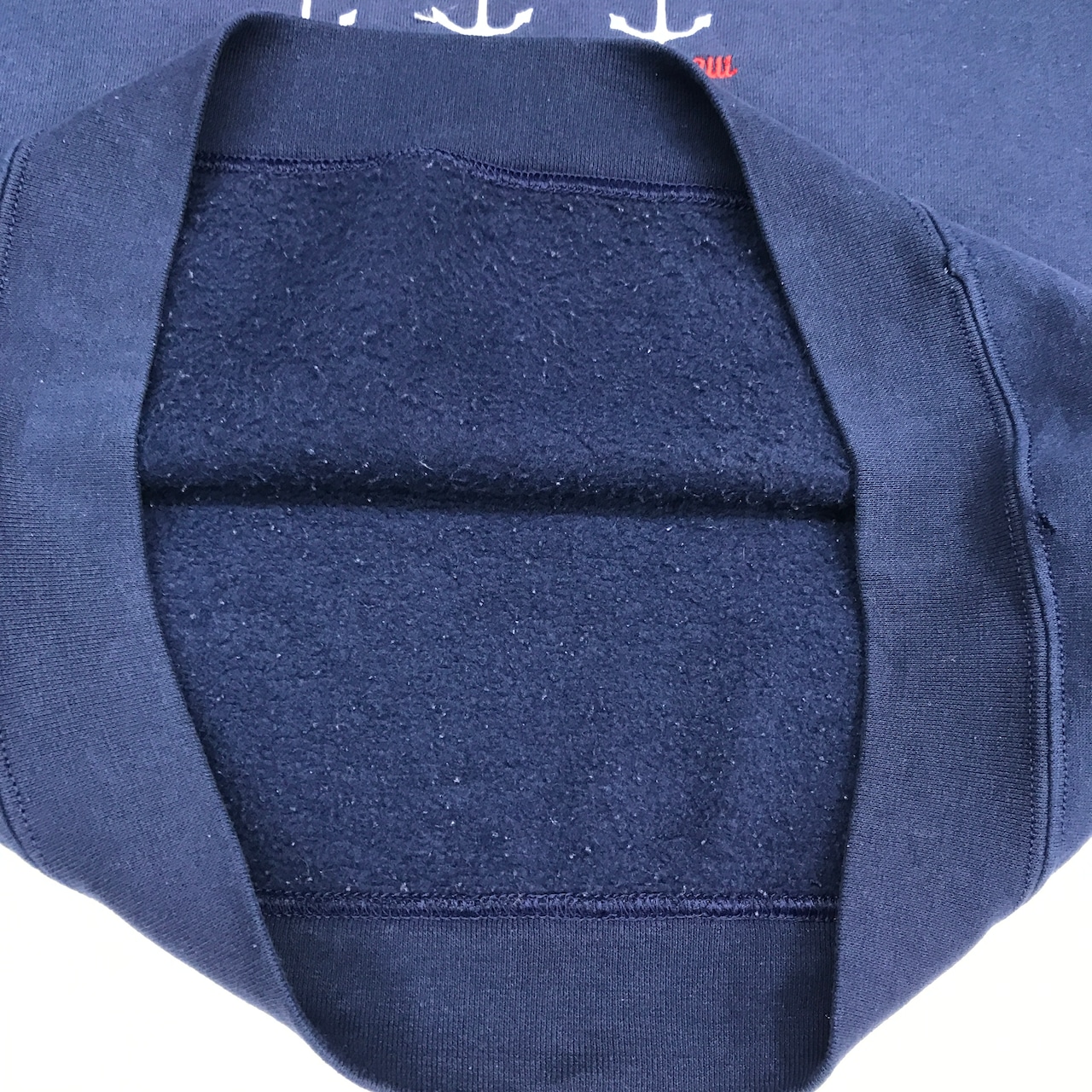 90年代頃のヨット刺繍トレーナーです。中地は起毛ですが毛玉が付いてます。左の腰リブ上部にホツレと穴があります。かわいいデザインです。