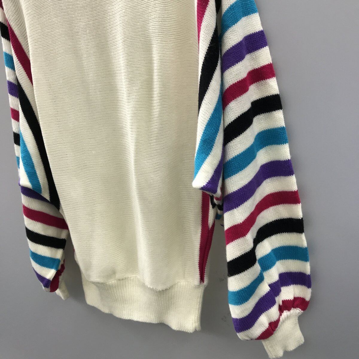 80年代頃のドルマンスリーブアクリルセーターです。ボートネックでカラフルでクレイジーなボーダードルマンスリーブが特徴です。裾の辺りに薄汚れがあるのとリブにホツレがあります。全体的に生成っぽい色味です。