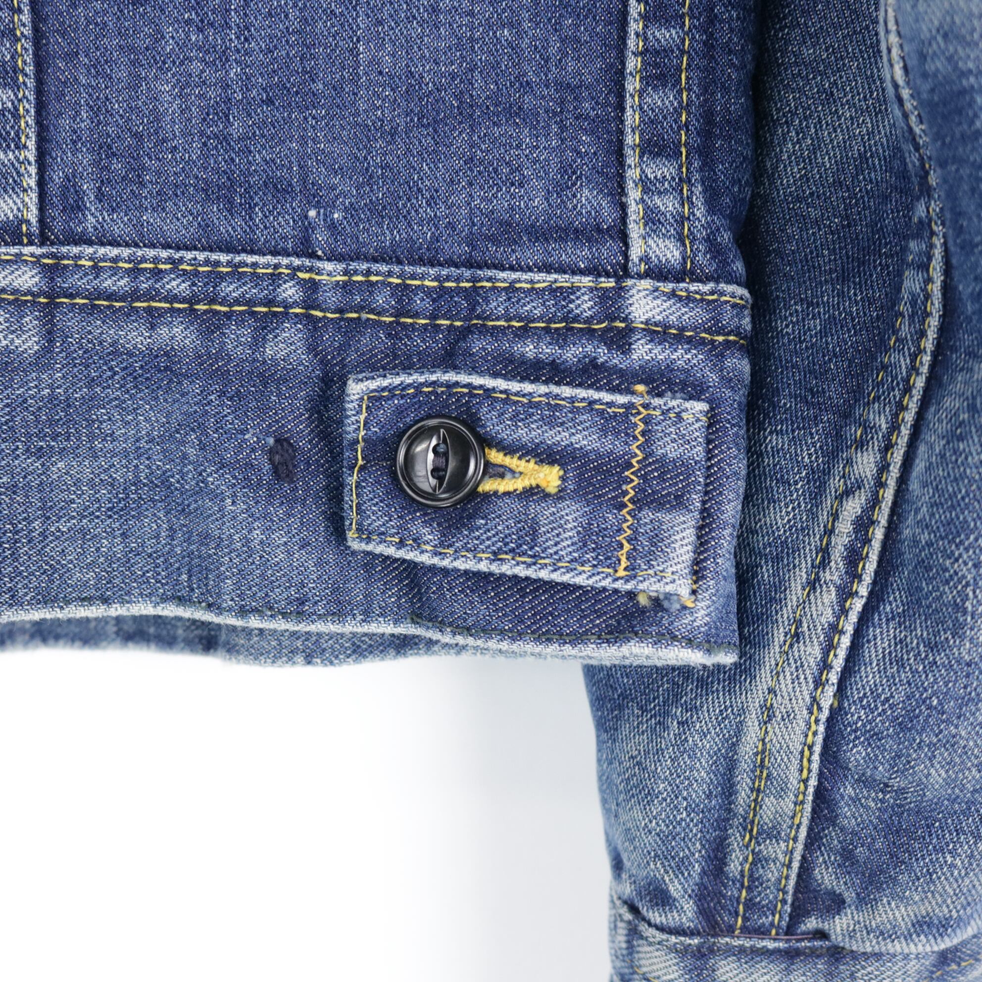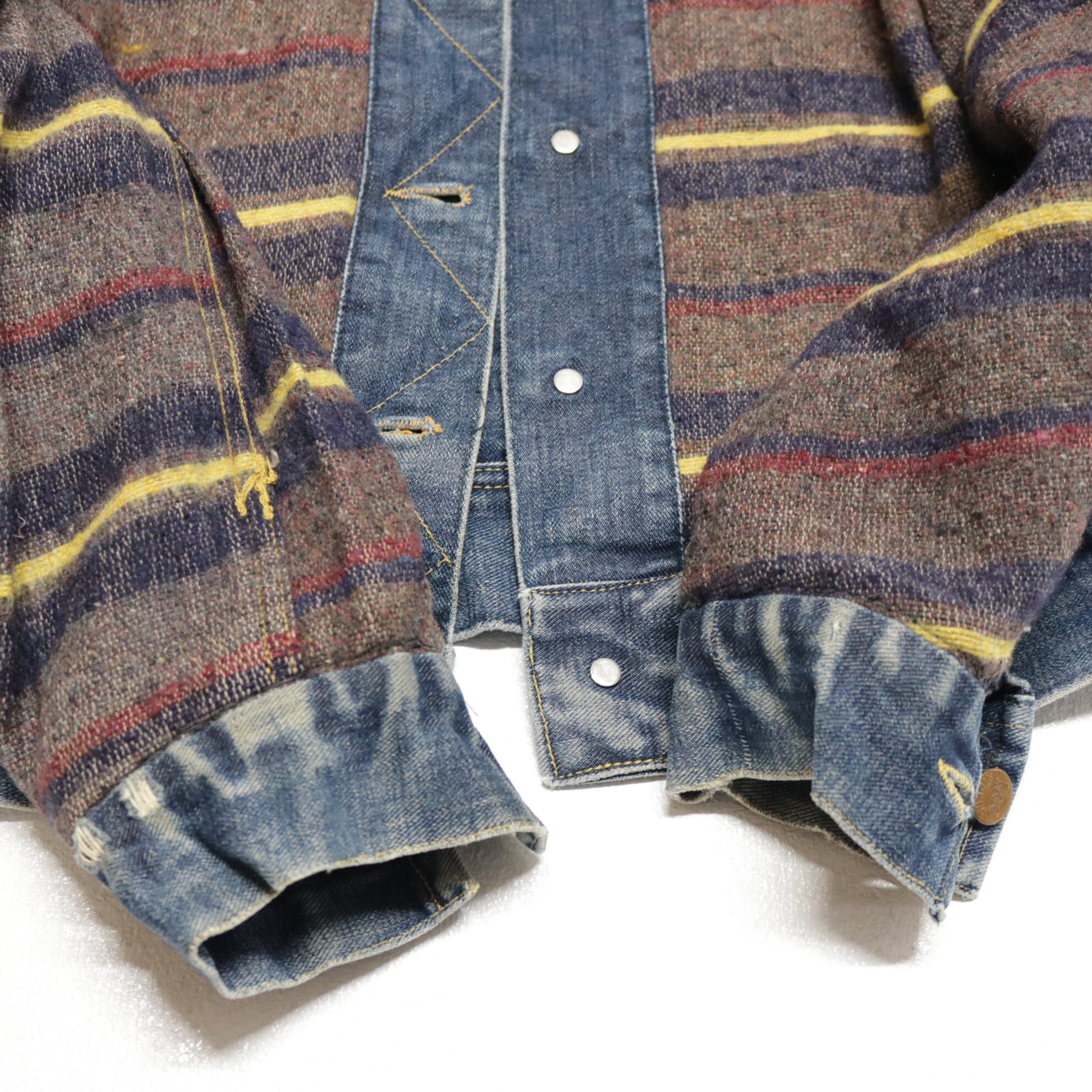70年代前半LEE ストームライダー ランチジャケットです。 ざっくり編み込まれた中地のブランケットはイエローのラインが入り刺繍タグが付きます。ポケットタブにMR無し。汚れは有りますが目立つダメージは無いです。アジャスターベルト猫目ボタンが1つ欠品しています。