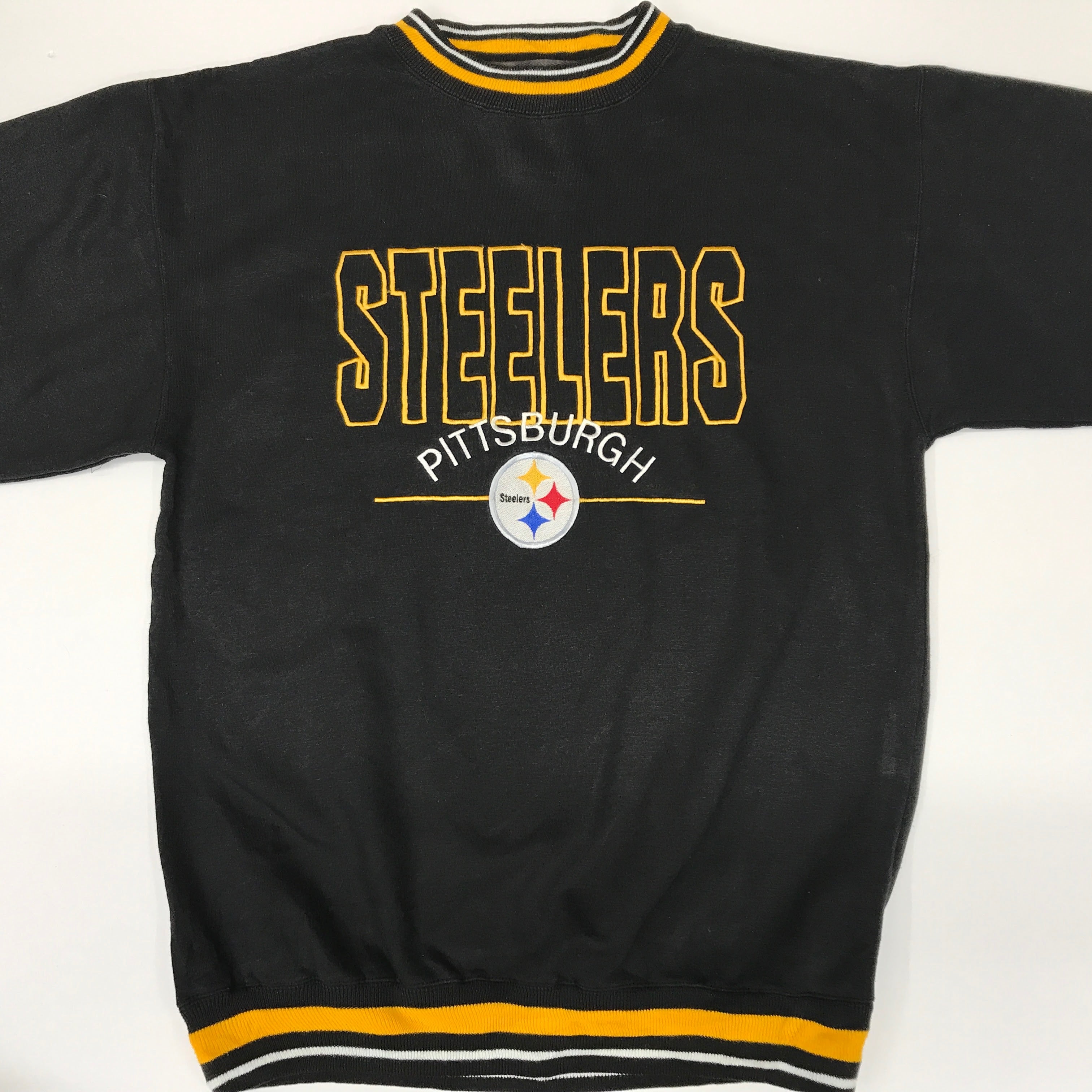 LOGO7 NFL ピッツバーグ・スティーラーズの刺繍でリンガースウェットです。目立つシミイタミなど見受けられませんが、少し着用感は有ります。裏起毛です。トリミングリブ