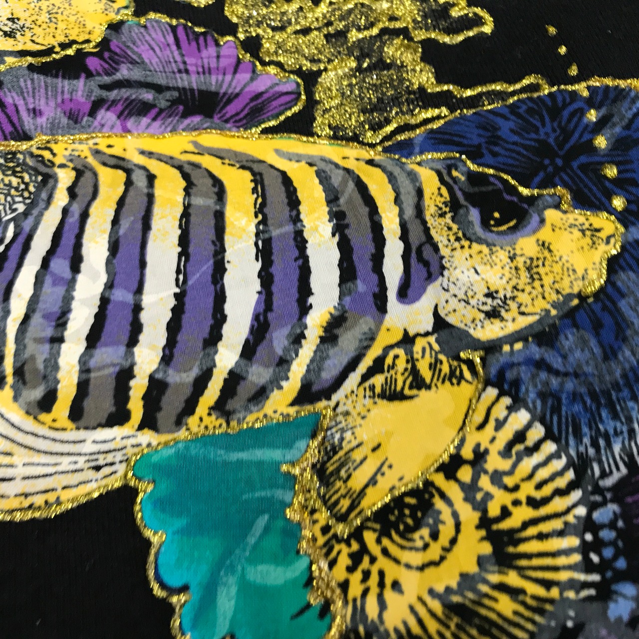 明るい蛍光ミントグリーンに黒とゴールドの熱帯魚の