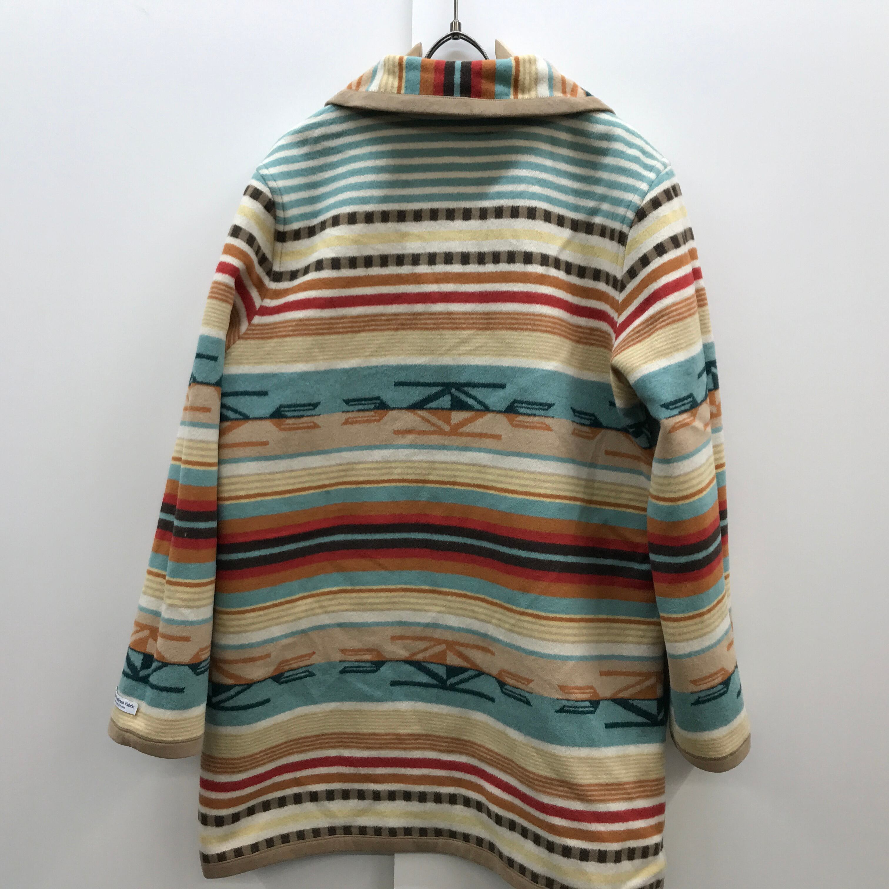 生地は100%VERGIN WOOL(トリムはポリエステル100%)両面ネイティブ柄のブランケットジャケットです。目立つ汚れやイタミなど見受けられませんが、見落とす場合もございます。コンチョボタンを6個使った贅沢な1枚です。