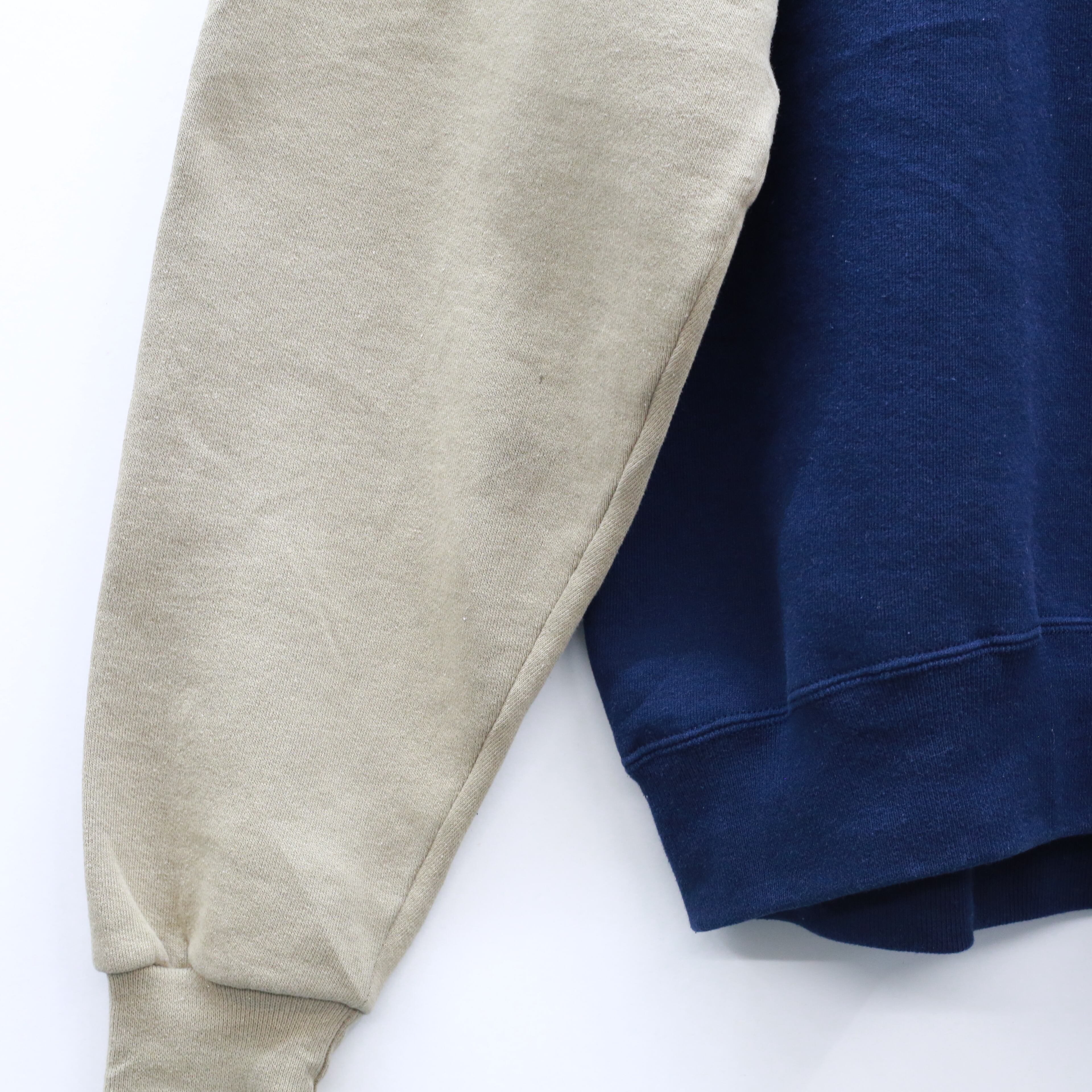 ラッセルアスレチックのハーフジップスウェットです。タグは刺繍になっており、90年代の商品だと思われます。ベージュ×ネイビーのいなたいカラーリング、適度にボリュームのあるボックスシルエットがかっこいいです。裏地は起毛になっており、防寒性もあります。全体的に着用感、フロント、ジップ右部分シミ、フロント左下部分3mmほどの穴、両袖ともに薄い黒い汚れがあります。近年アメリカ製の球数は減ってきており、希少性の高いものとなっております