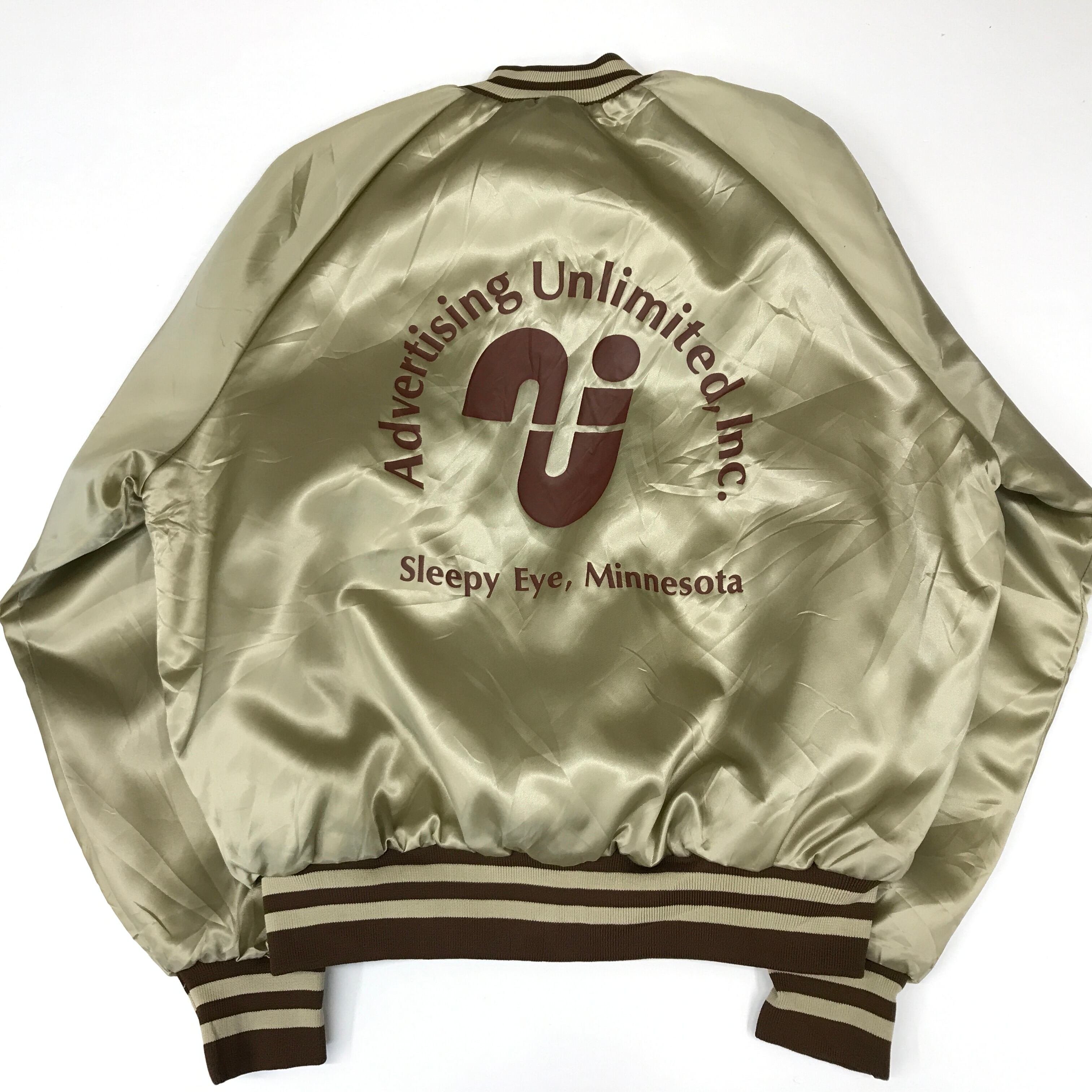 KING LOUE PRO FIT 80年代 USA製 ナイロンシャンパンゴールド光沢サテンベースボールジャケット ワンポイント刺繍 背面企業プリント入り