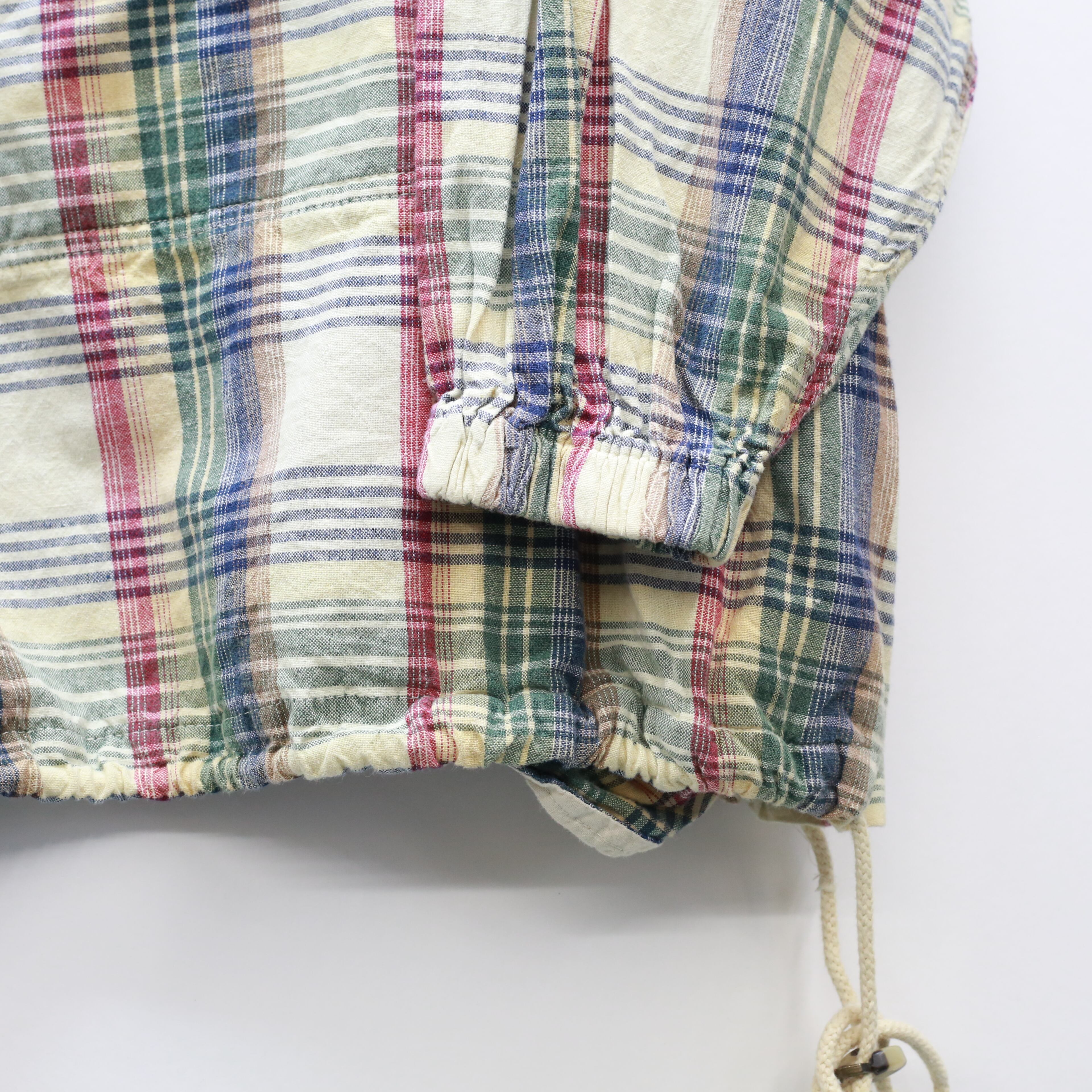 パリスポーツクラブのアノラックパーカーです。90年代〜00年代の商品だと思われます。柔らかい色合いのチェックや、身幅の広いゆるいシルエットがリゾート感を醸し出します。フード部分やウエストのロープや、カンガルーポケットのボタンのデザインや、サイドポケット等、緩めのデザインらしくない作りの細かさがポイントです。全体的に着用感あり。
