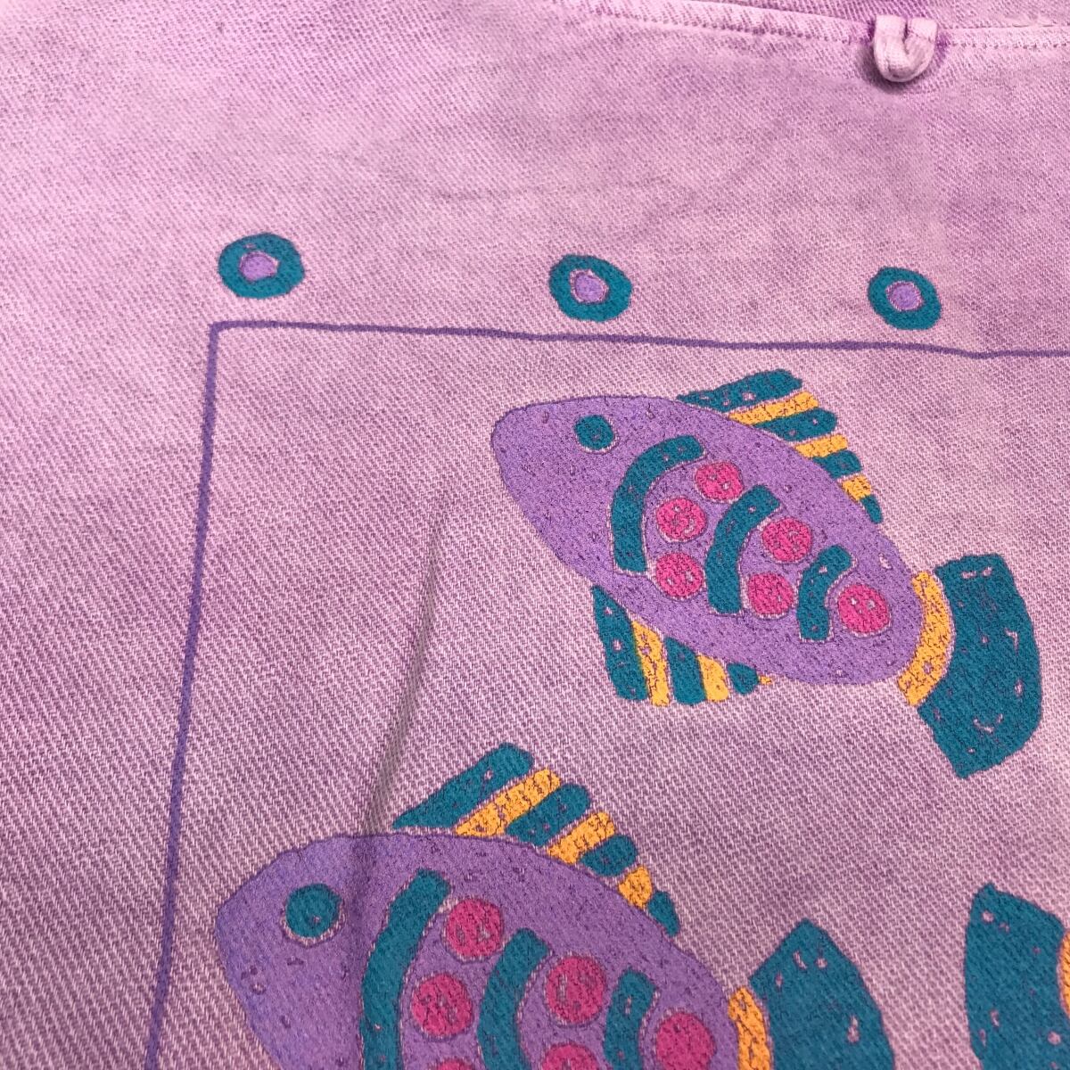FRESH PRODUCE フレッシュプロデュース 80〜90年代 USA製 後染め モックネック おさかなプリント コットンツイルカットソー パステルピンクパープル レディースXXL