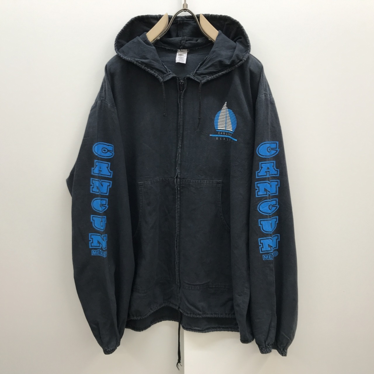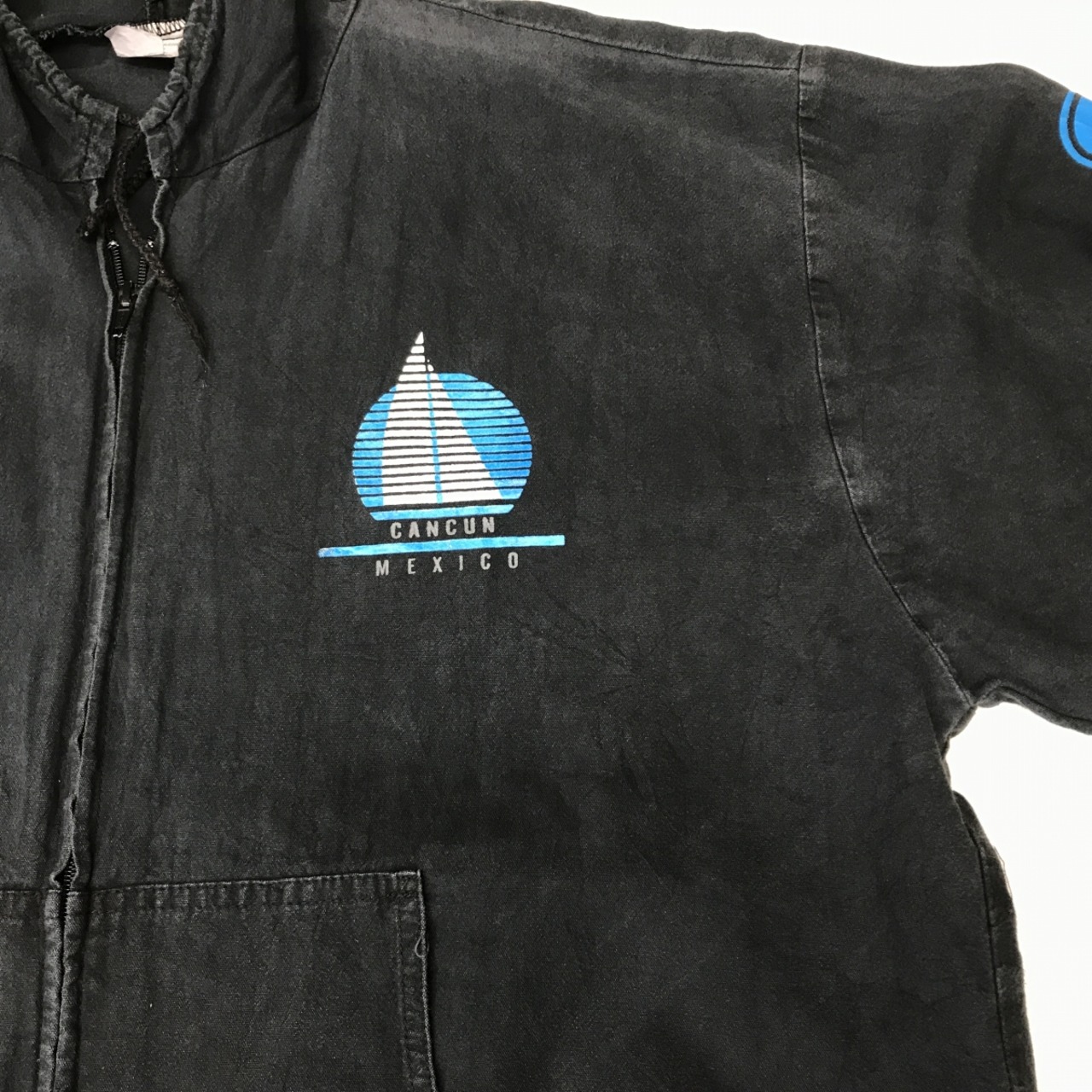 80〜90年代 ビンテージ 薄手コットン ジップパーカー ビーチジャケット CANCUN MEXICO ヨットセイリング柄 黒 XL相当