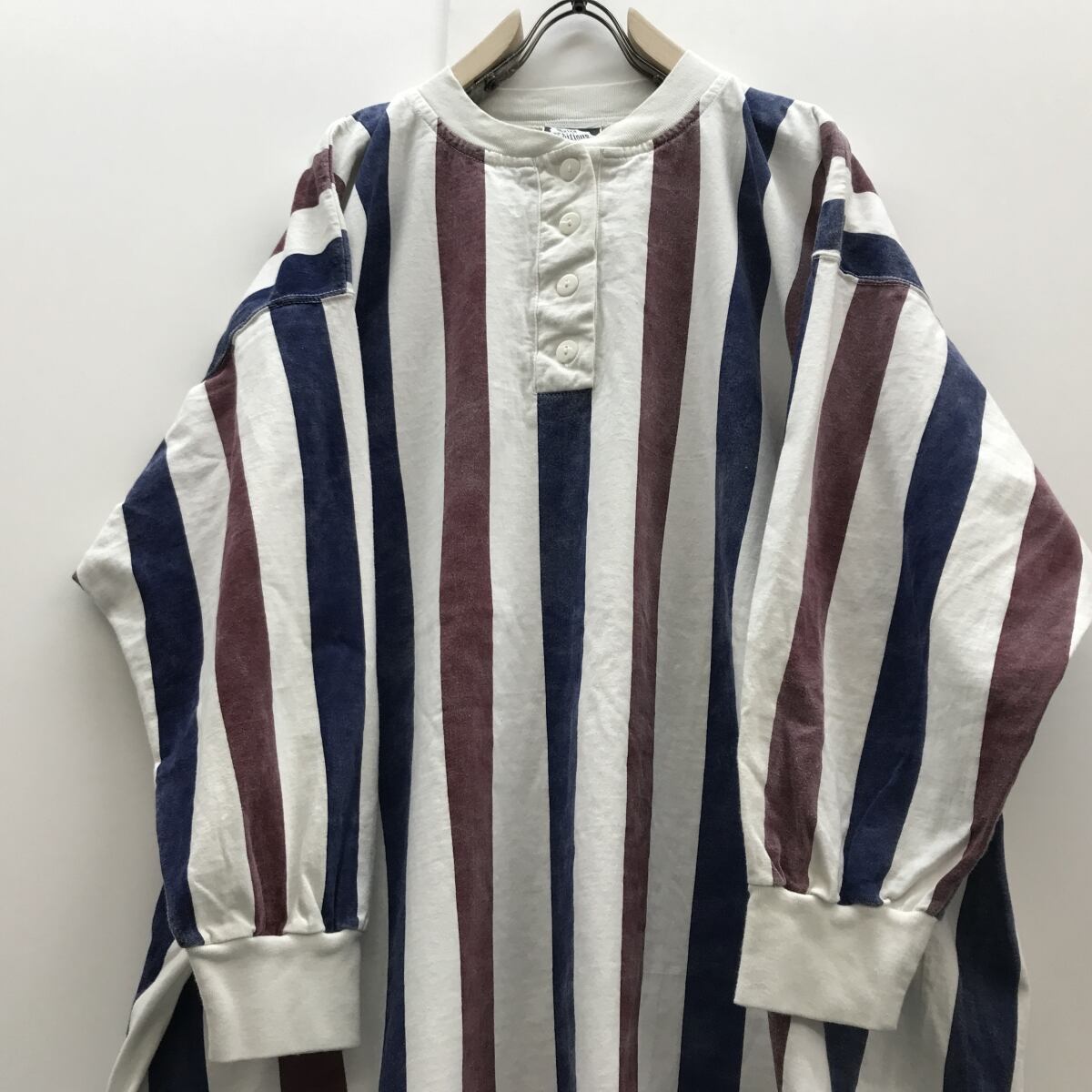 EXTRA EDITIONS ウォッシュアウト ストライプ ヘンリーネックTシャツ 4ボタン 5分 7分丈 ロング丈 3XL