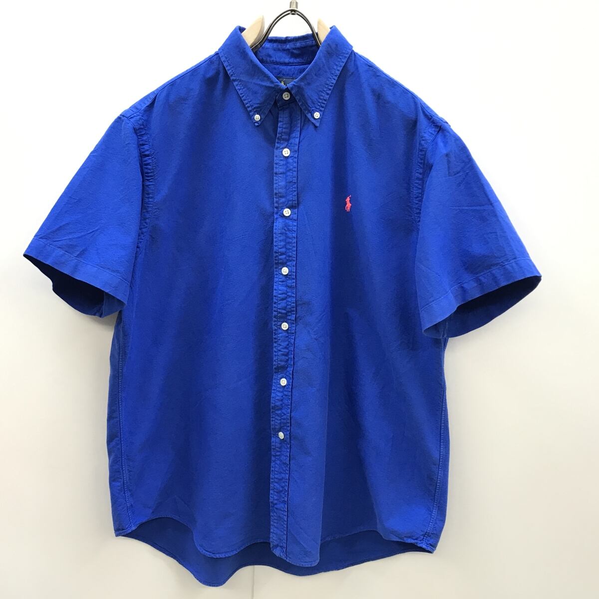 POLO by Ralph Lauren ラルフローレン 半袖コットンシャツ ボタンダウンシャツ ワンポイント 蛍光ピンクポニーロゴ 刺繍 旧タグ US XLサイズ ロイヤルブルー