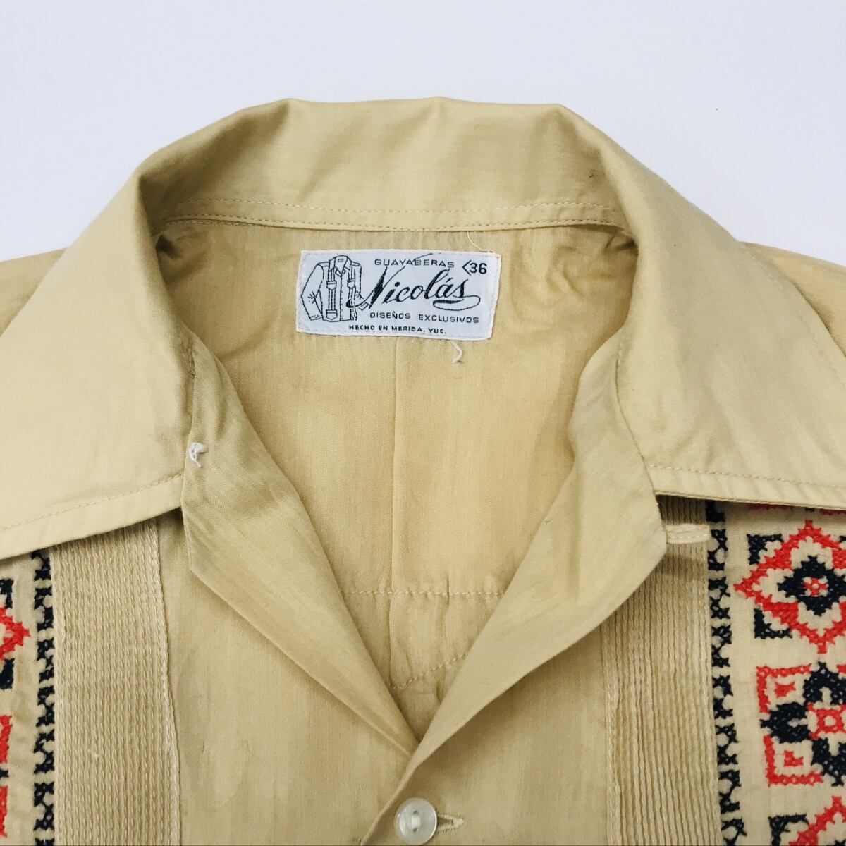 NICOLAS GUAYABERA SHIRTS 70年代 ビンテージ 半袖キューバシャツ 襟芯ロングポイント カラークロスステッチ刺繍入り ベージュ S