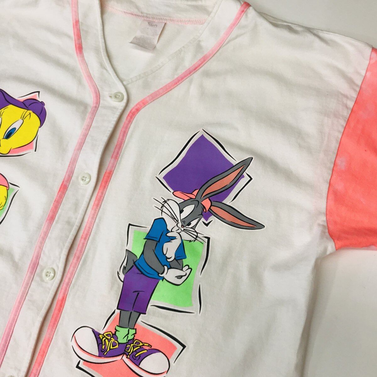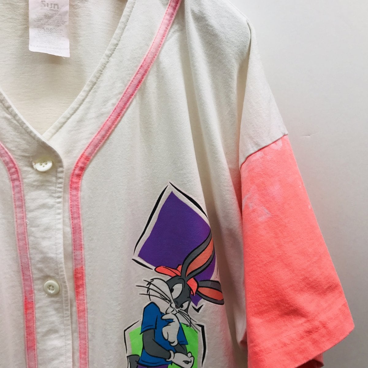 サンスポーツウェアー 90年代 LOONEY TUNES ルーニーテューンズ トゥイーティーとバッグスバニーキャラクタープリント 蛍光ピンク 半袖前開きベースボールシャツ X-LARGE