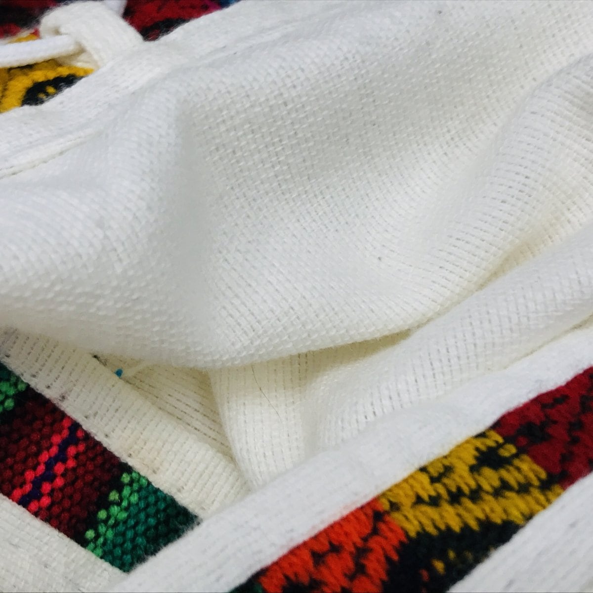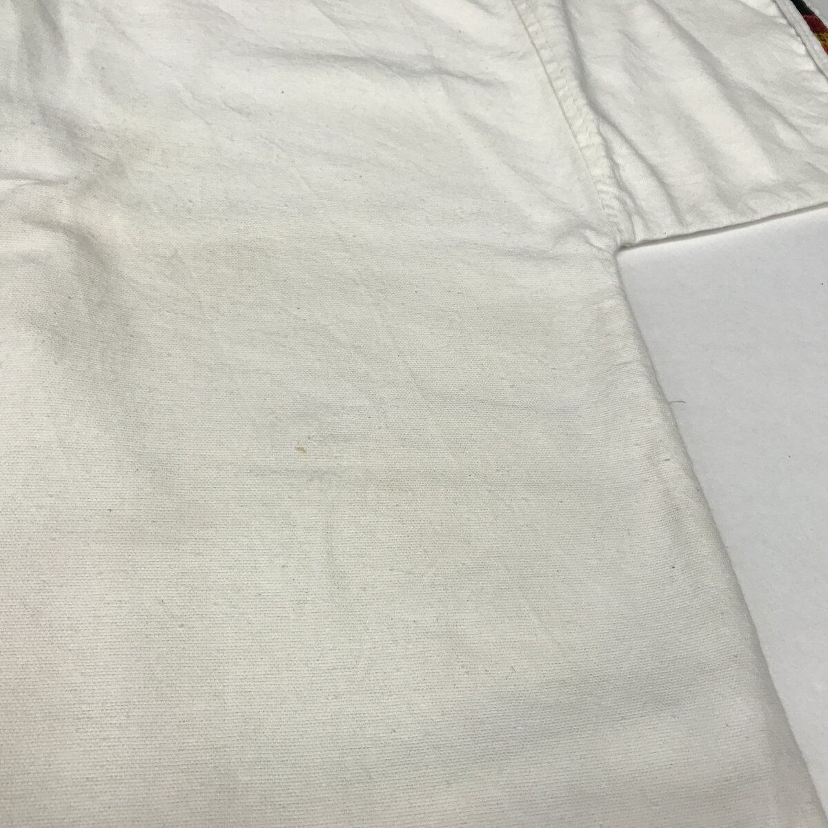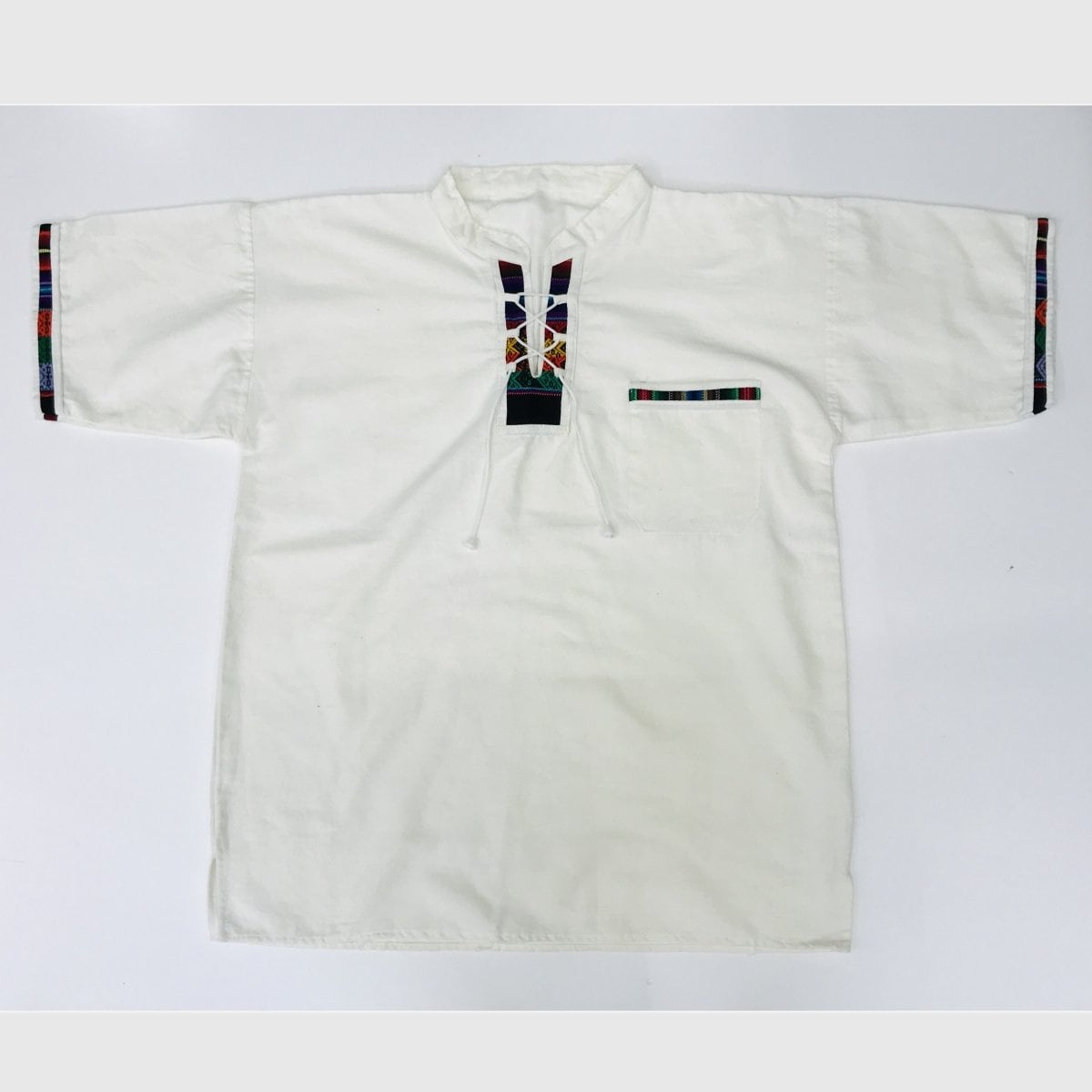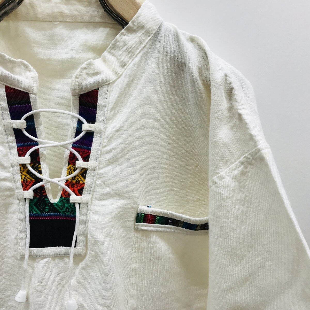 メキシカン ガテマララグ柄の飾り付き スタンドカラ? エスニック半袖シャツ レースアップ プルオーバー 白 XL