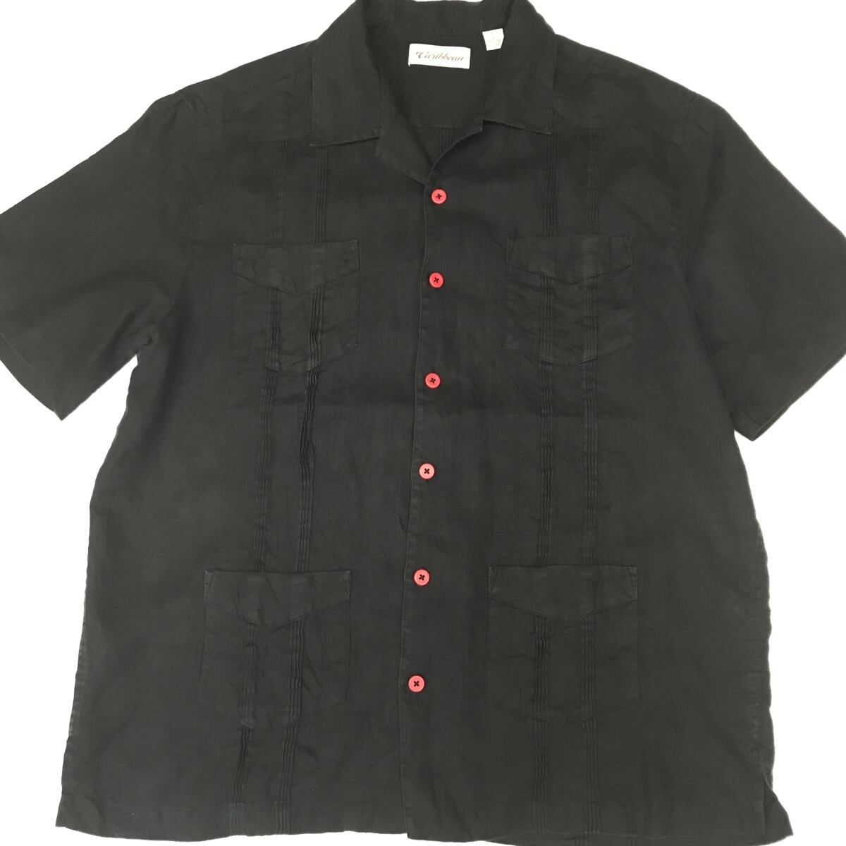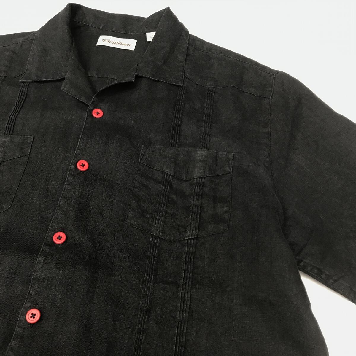 CARIBBERN カリビアン 80〜90年代 リネン100% 半袖キューバシャツ レッドボタン! GUAYABERA SHIRTS ブラック XL