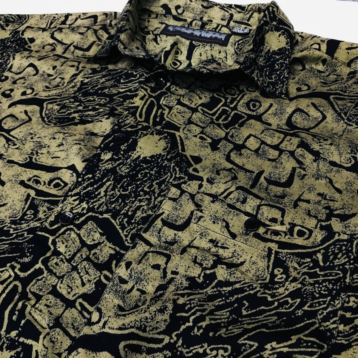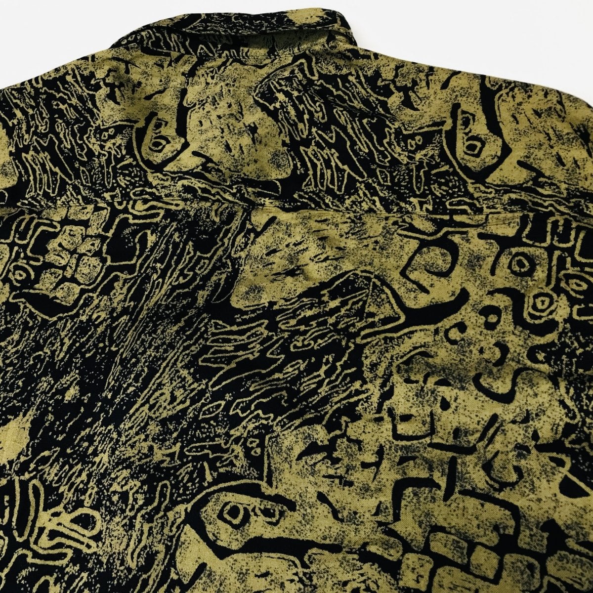 メガゾーン 80〜90年代 レーヨン 総柄 半袖シャツ 洞窟 遺跡 流木・? ゴールドカーキ? XXL