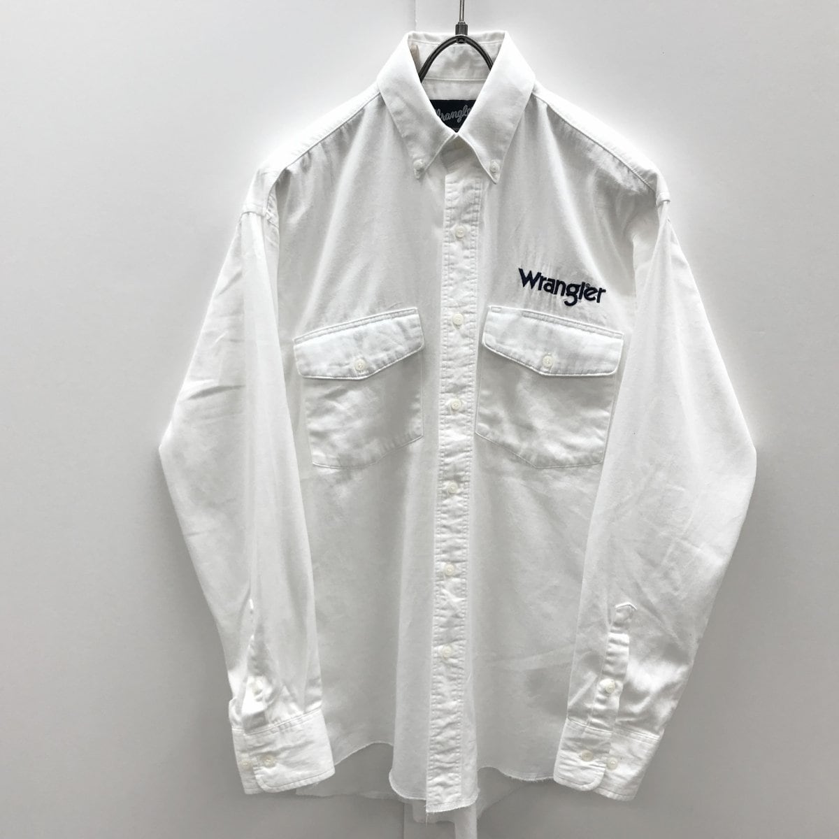 WRANGLER ラングラー 80〜90年代 コットンツイル ウエスタンスタイル 長袖ボタンダウンシャツ ロゴ刺繍入り 真っ白 L相当