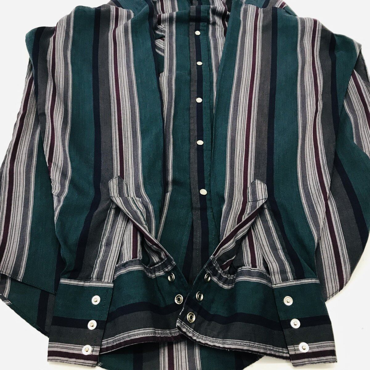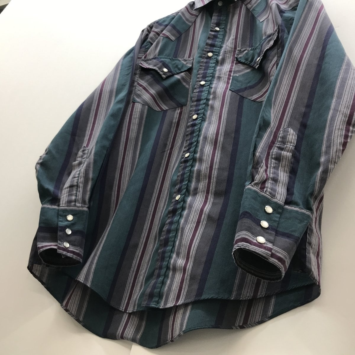 PLAINS プレインズ 80〜90年代 マルチストライプ 長袖 ウエスタンシャツ グレー・ダークブルーグリーン L