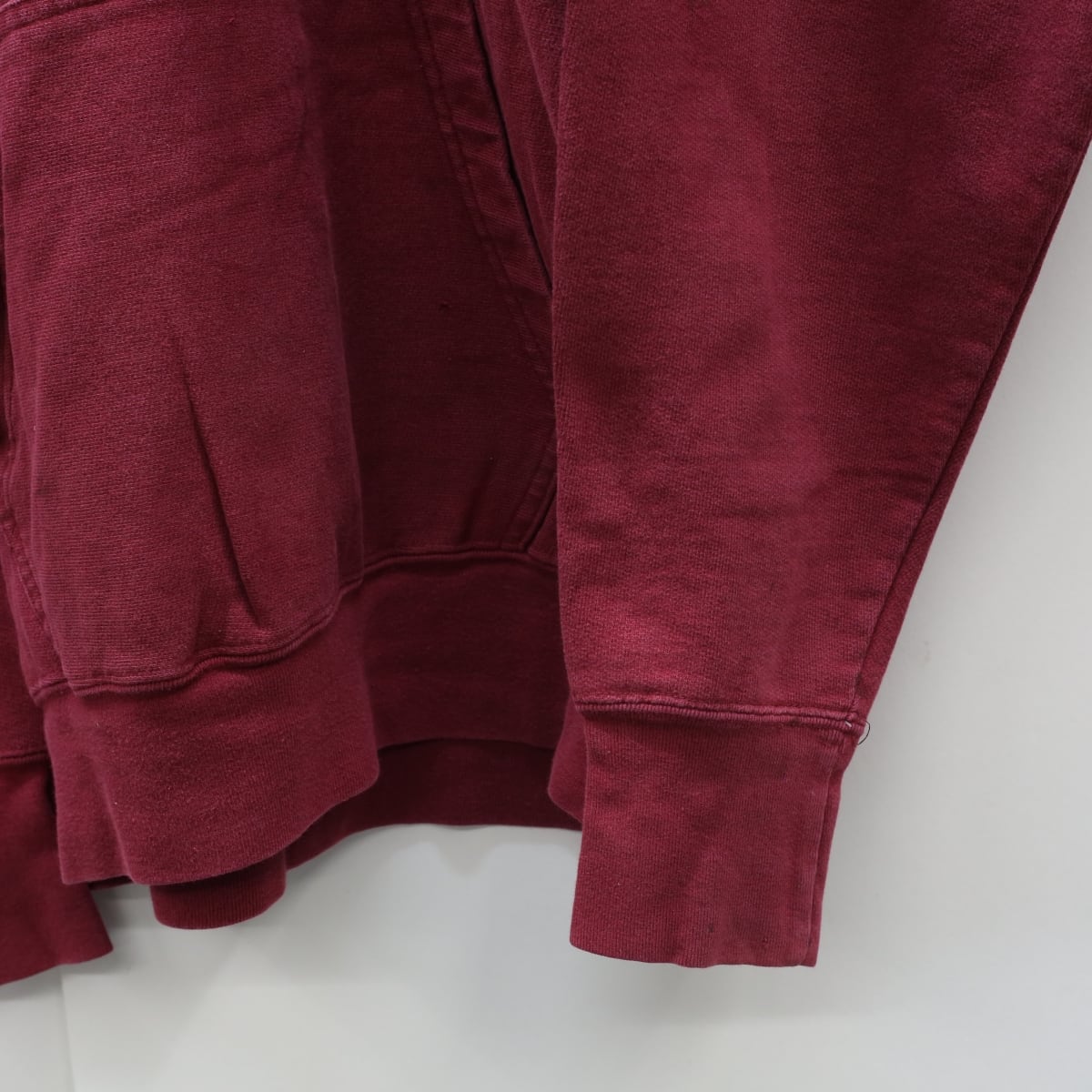 全体的に着用感・色あせります。前身頃下部・右袖黒い汚れ多数あります。後身頃上部色抜けあります。