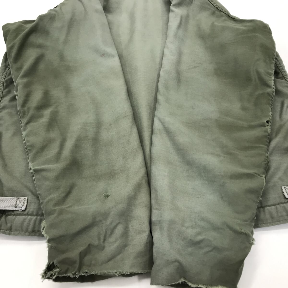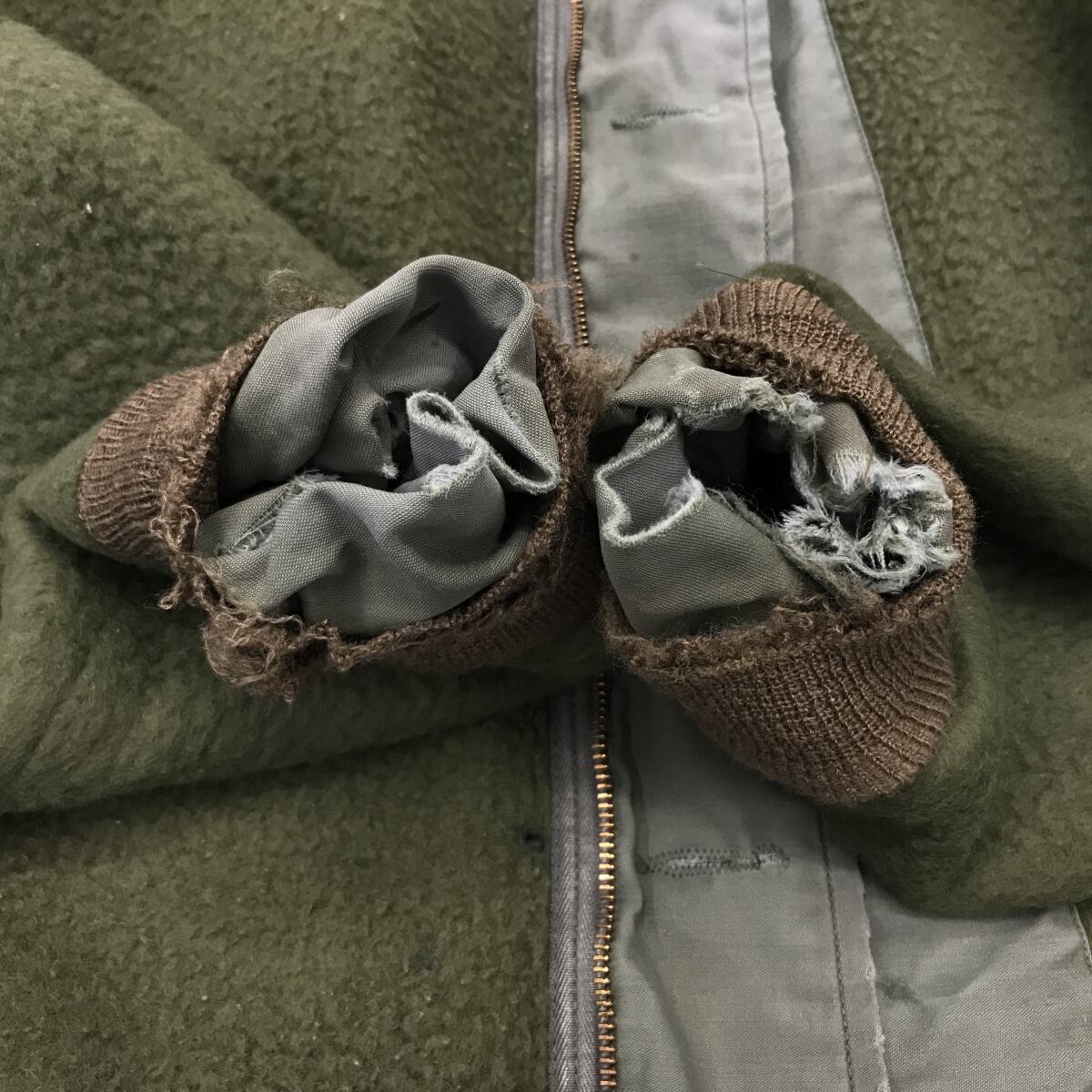 襟、袖、肘 袖先、リブに汚れ、裂け、ダメージあります