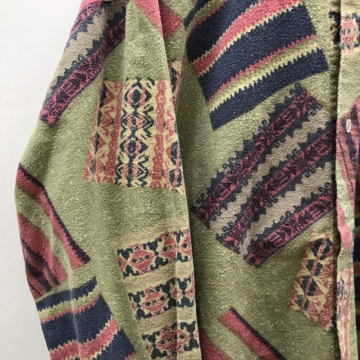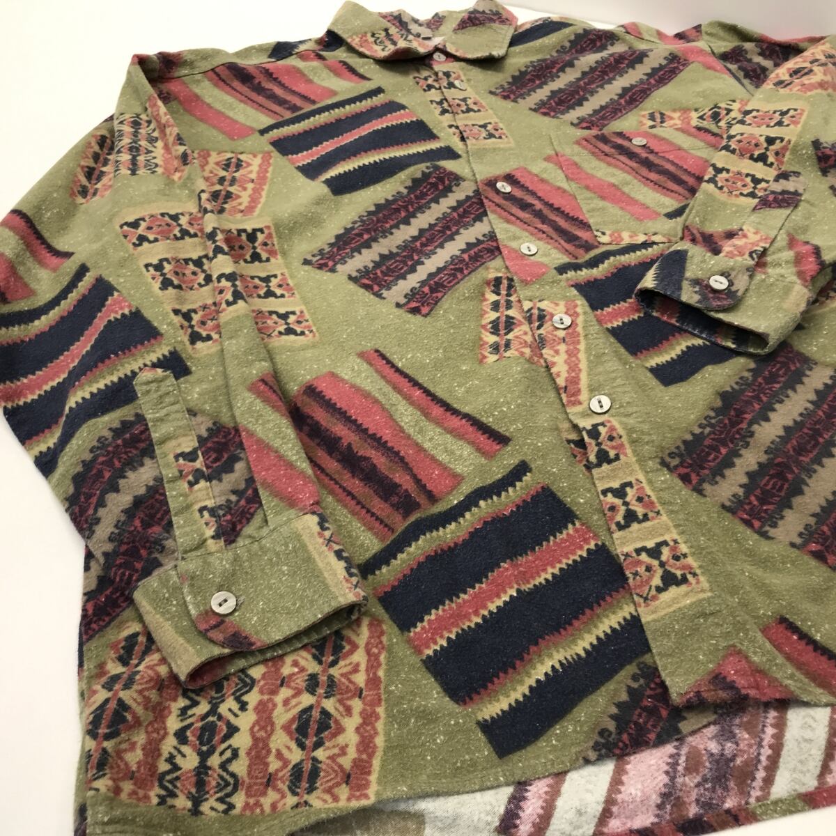 NEW FAST C&A ニューファスト 美品!80〜90年代 ユーロヴィンテージ 総柄ネルシャツ 長袖シャツ グリーン 43/44 XL