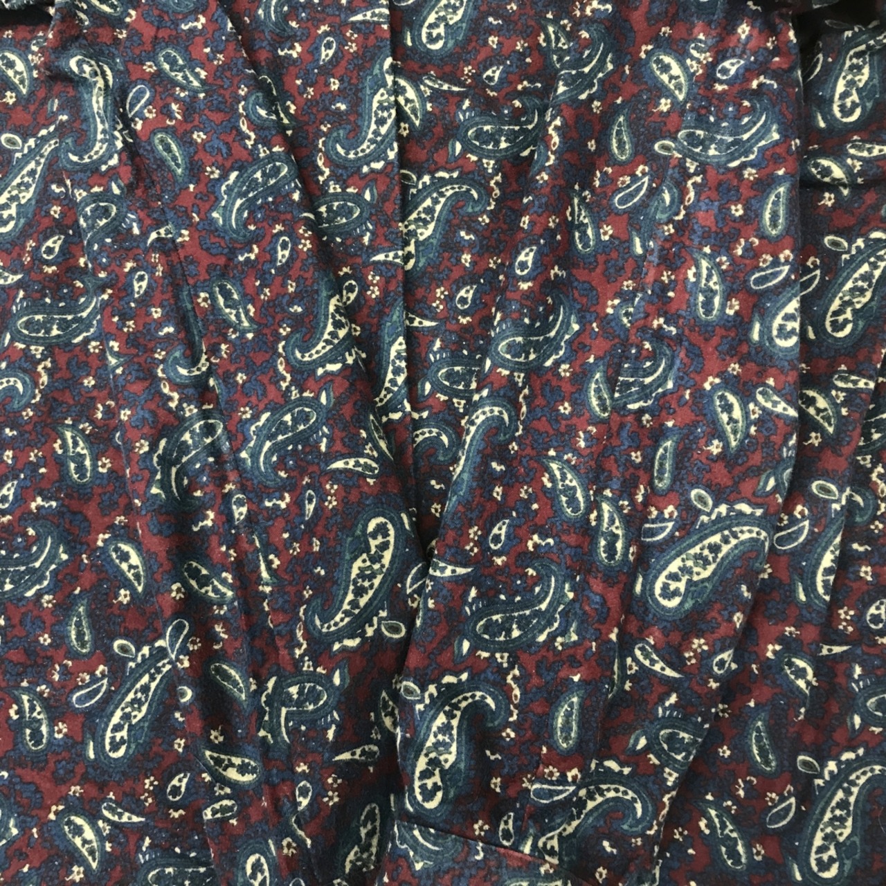 柄も上品さがある、濃い赤色に青緑のペイズリーが