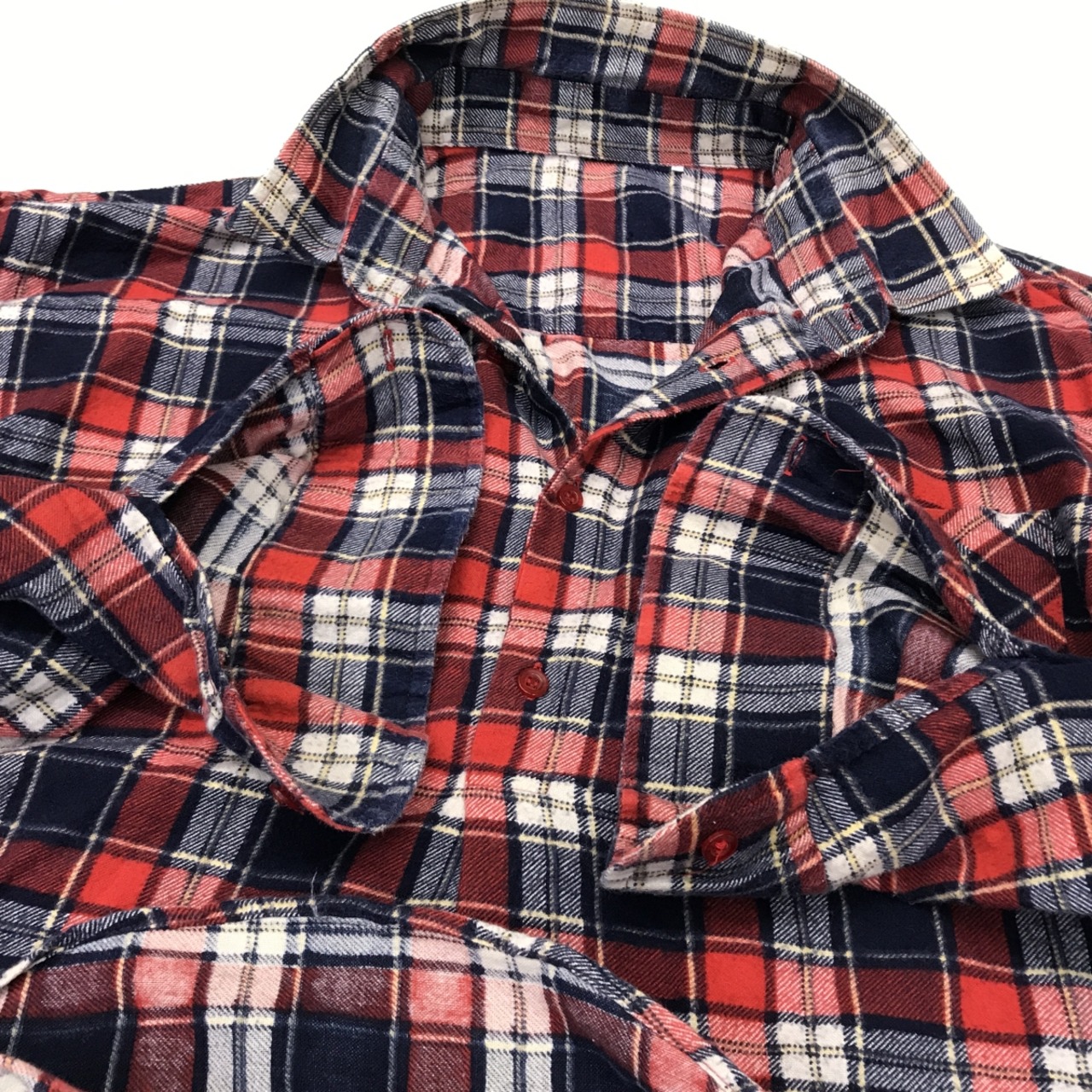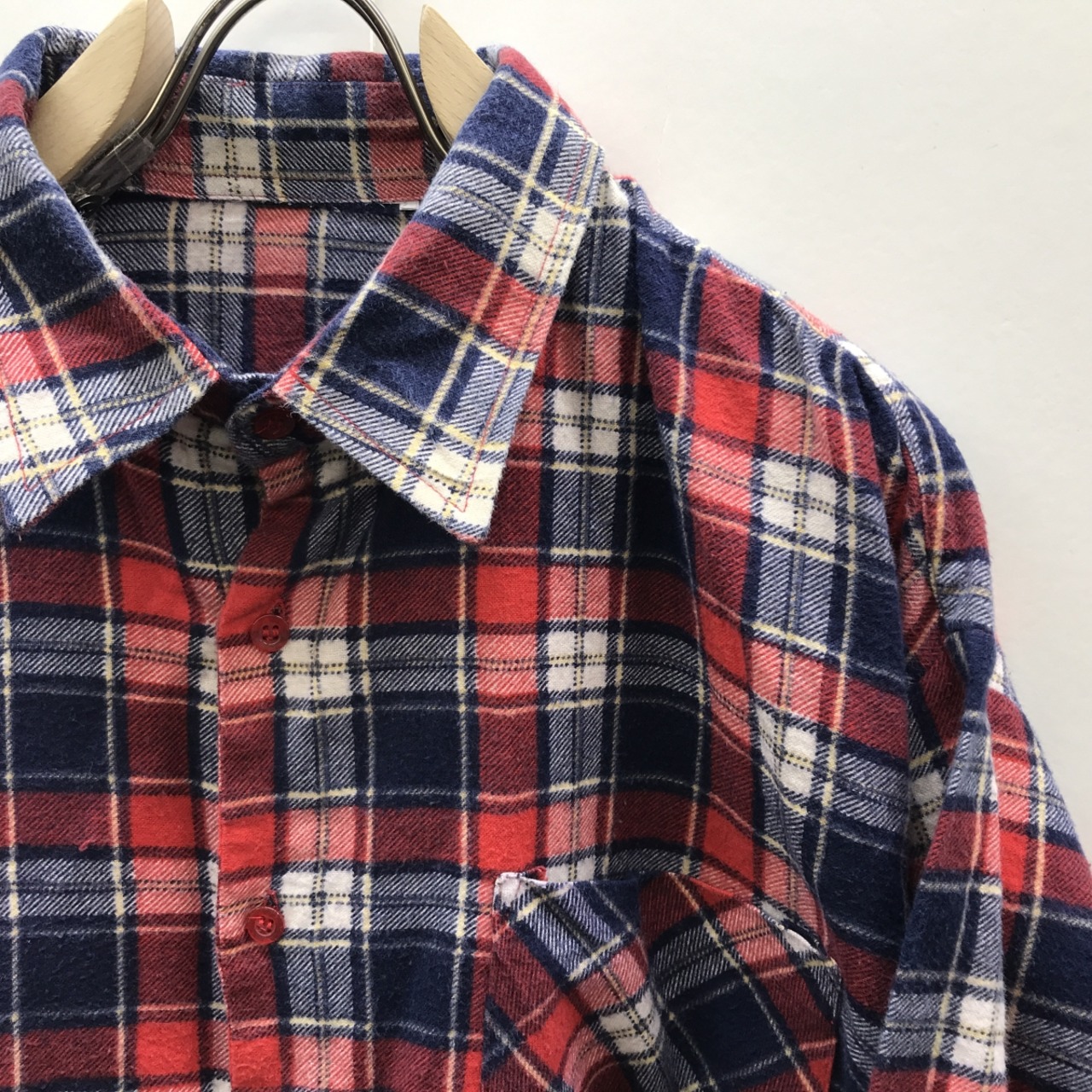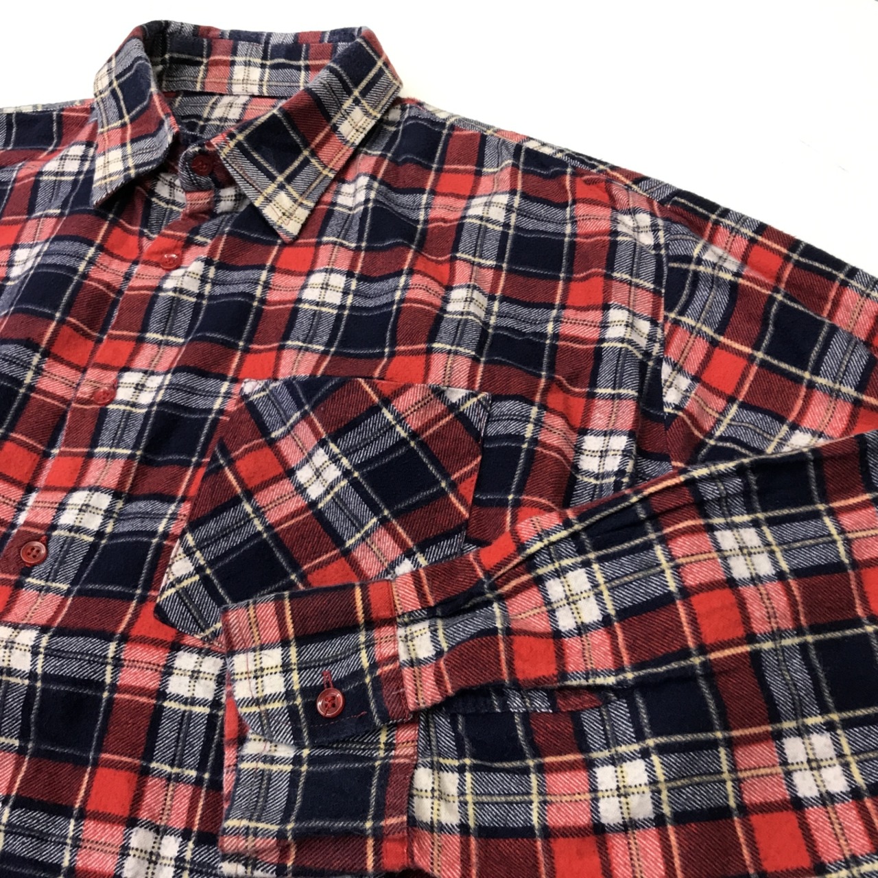 EURO VINTAGE 70〜80年代 ユーロ プリントネル チェック柄 襟芯入りグランパシャツ 長袖 レッド系 X