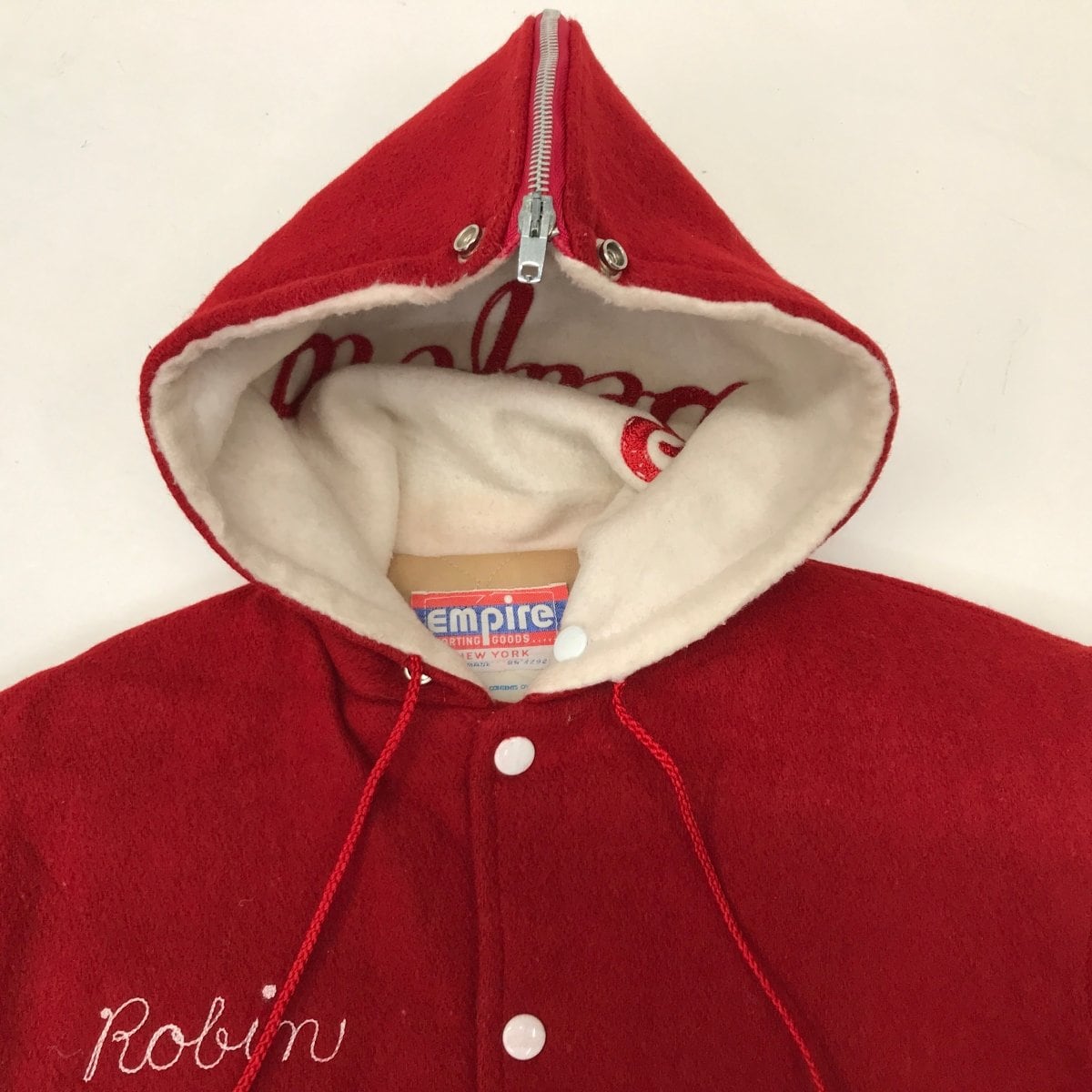 裏地の色目と素材感、ネームとフードのチェーンステッチが素敵♪