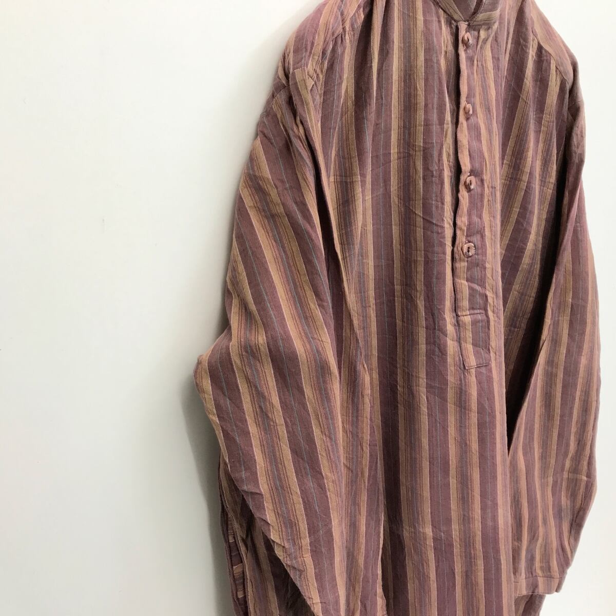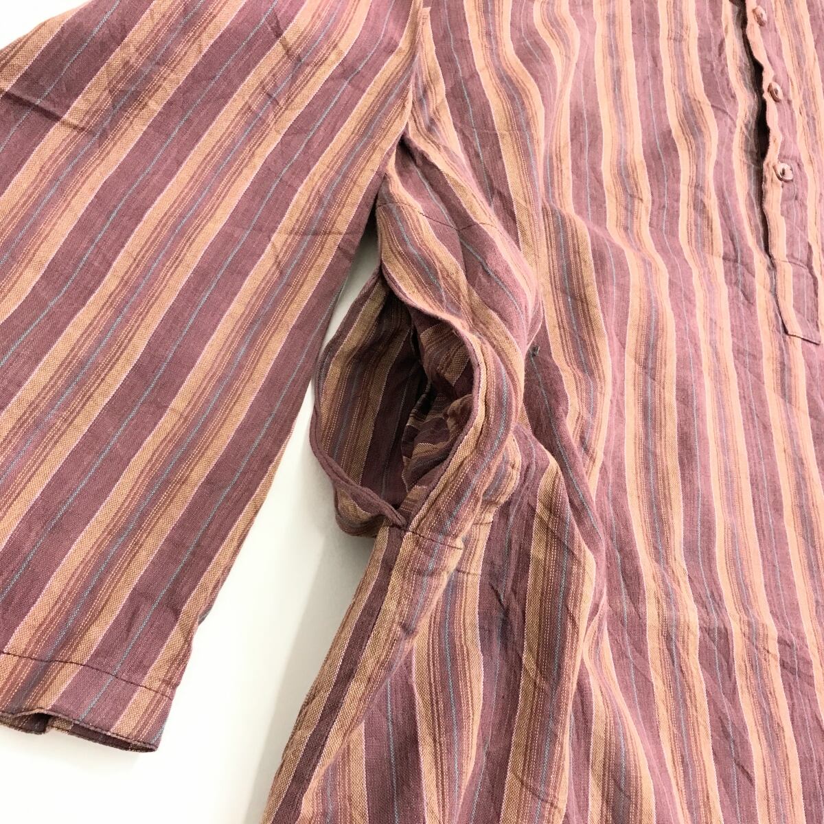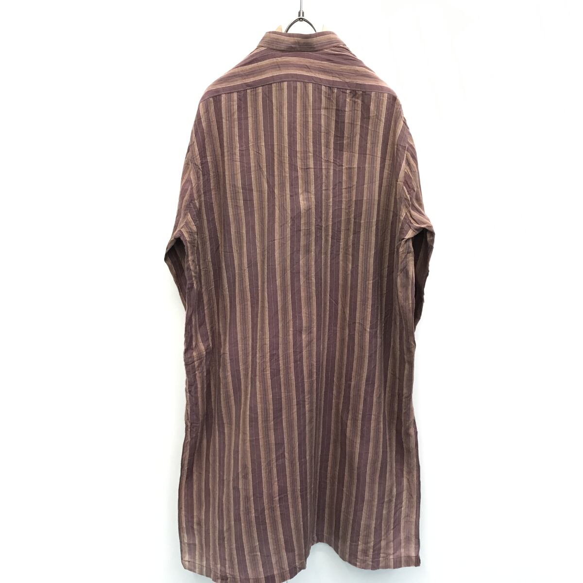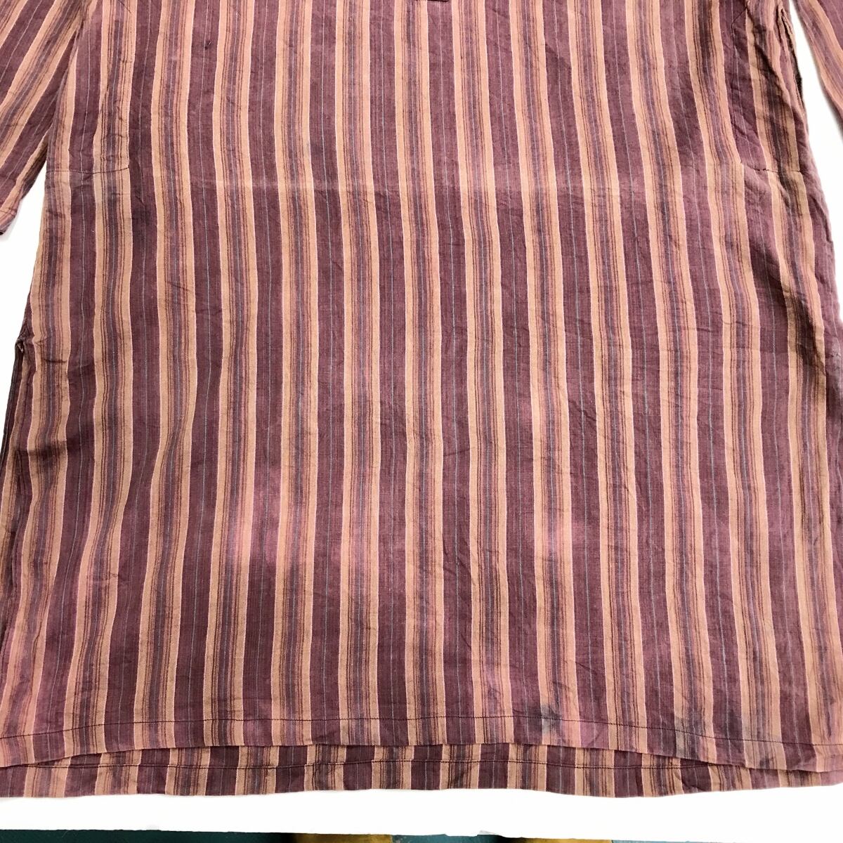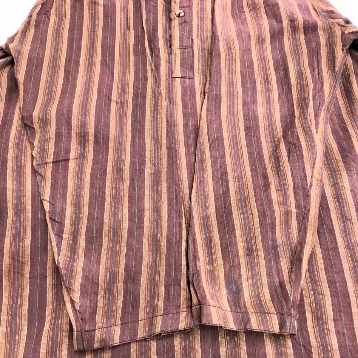 USED VINTAGE 70年代前後 バンドカラー ロング シャツワンピース コットンリネン マルチストライプ L 長袖