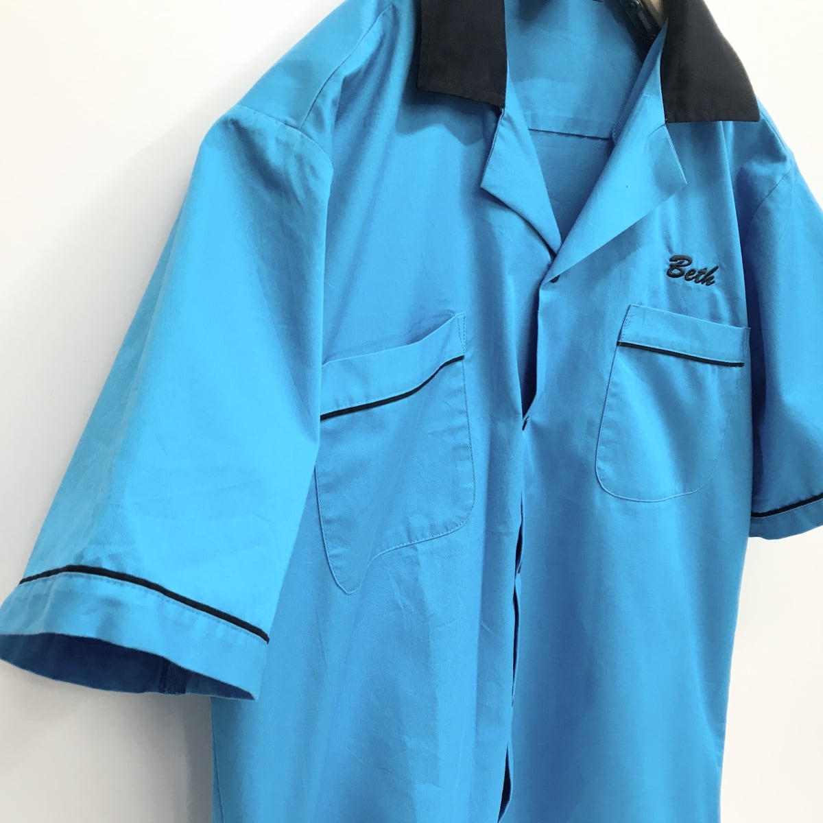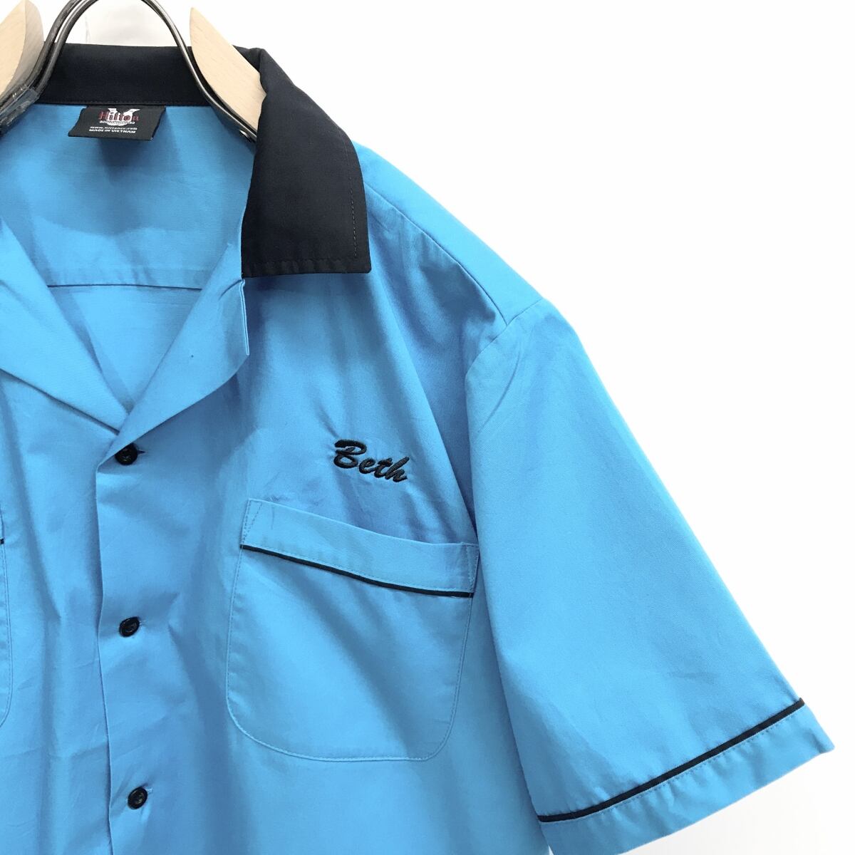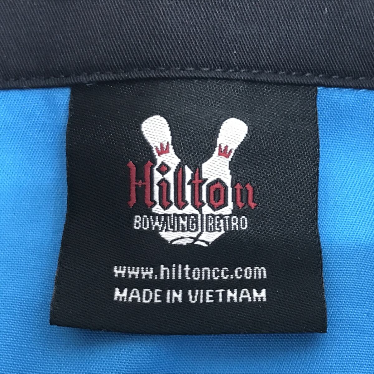 HILTON ヒルトン 00年代 ポリコットン ボーリングシャツ胸ネーム刺繍入り ブラック・ターコイズブルー オープンシャツ L 半袖
