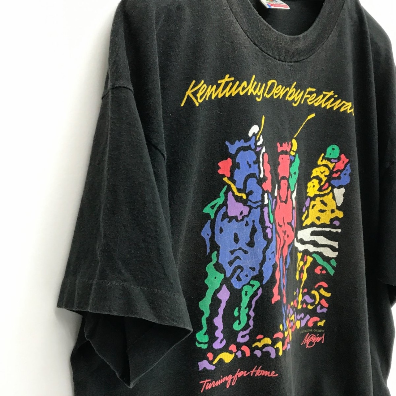 FRUIT OF THE LOOM|フルーツオブザルーム 90年代 USA製 HORSE RACING ポップアート ペインティング風 Tシャツ ブラック XL 半袖 タグ