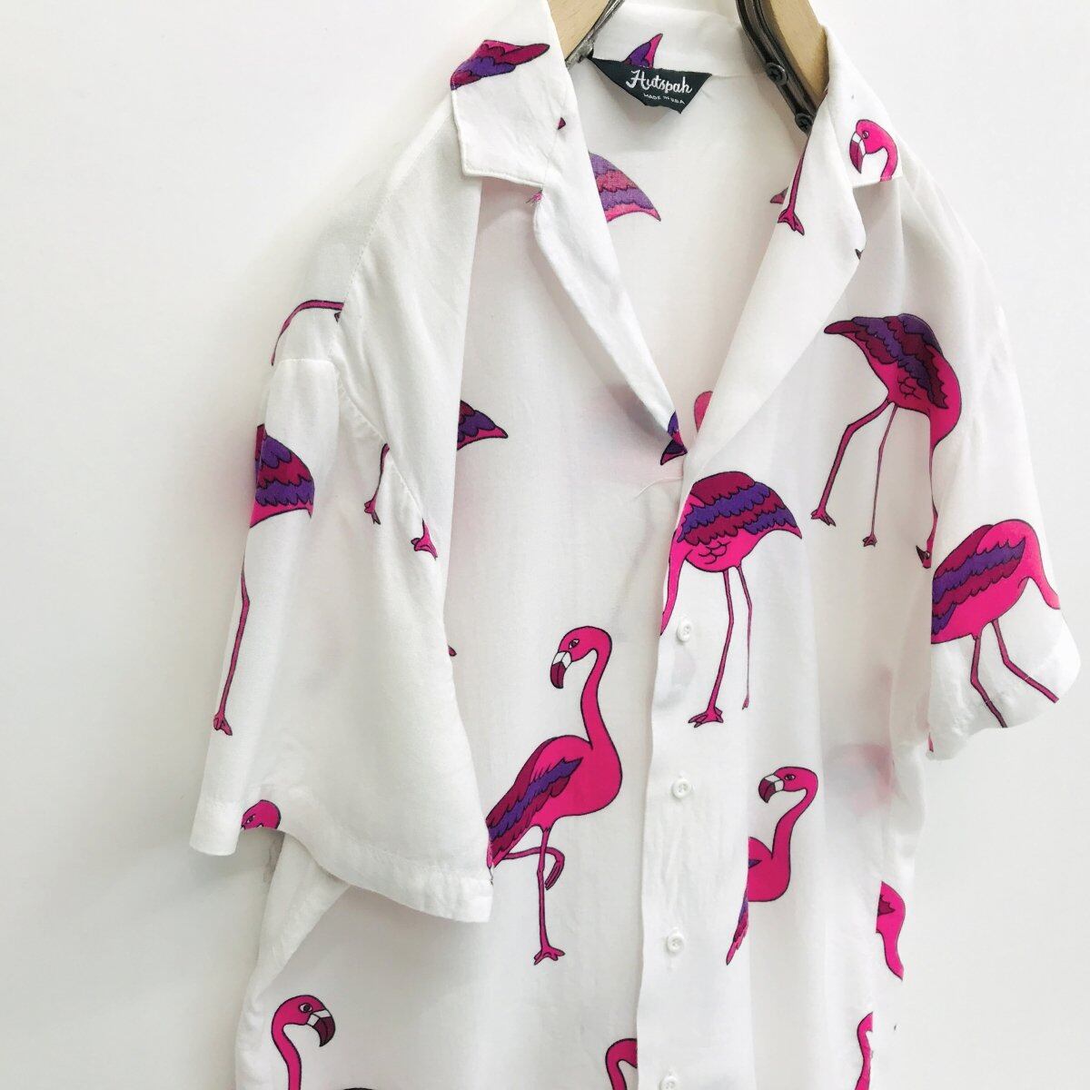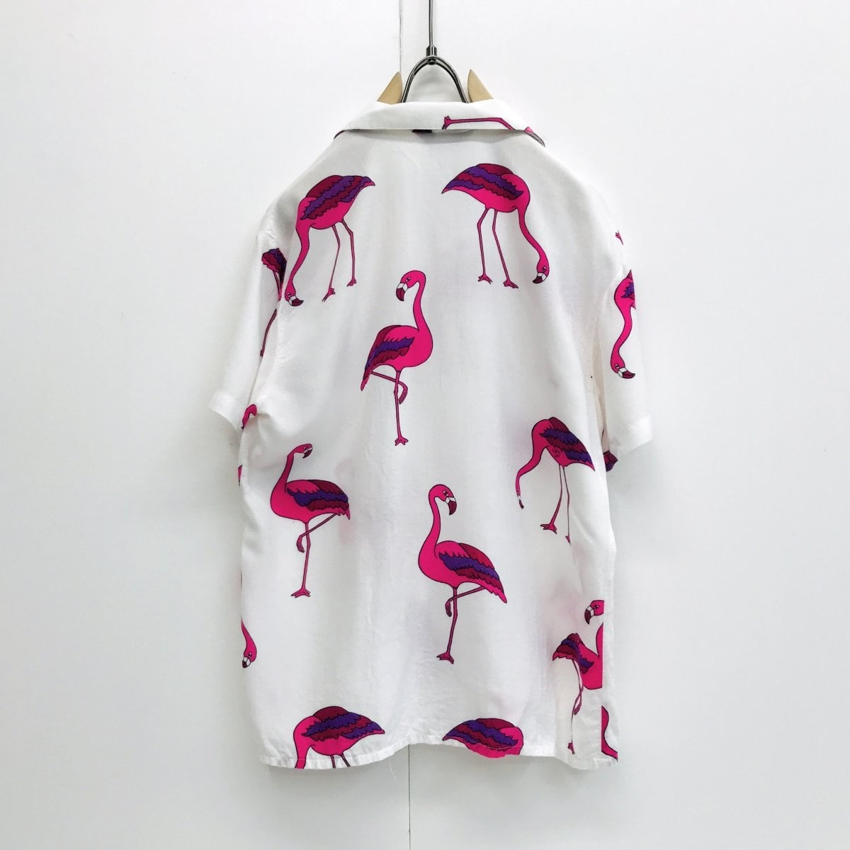 ハッツパー 80〜 90年代 USA製 ピンク フラミンゴ プリント 総柄 開襟 オープンカラーシャツ ホワイト S 半袖 タグ