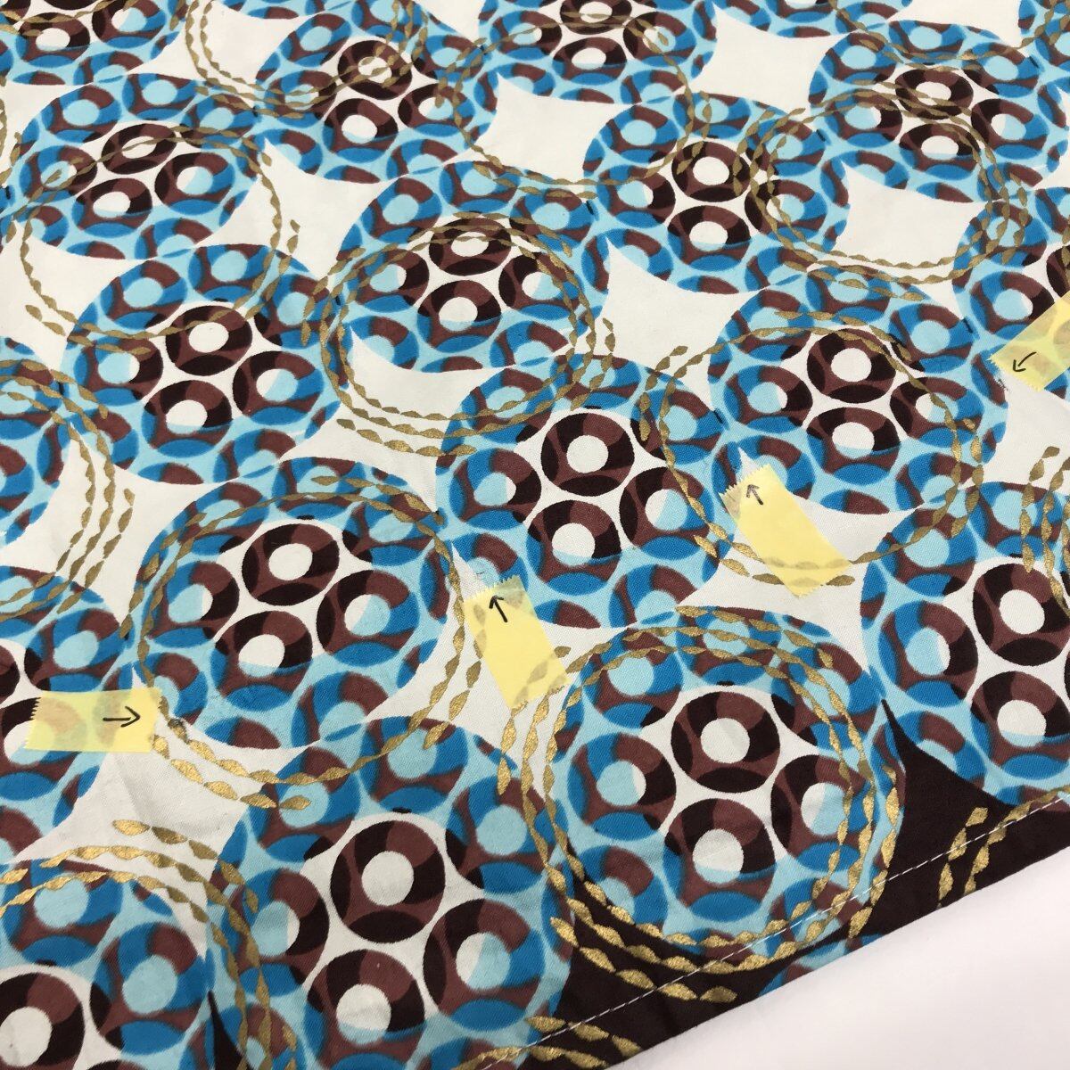 柄生地の上に金色のサークル柄のプリントが施されていて