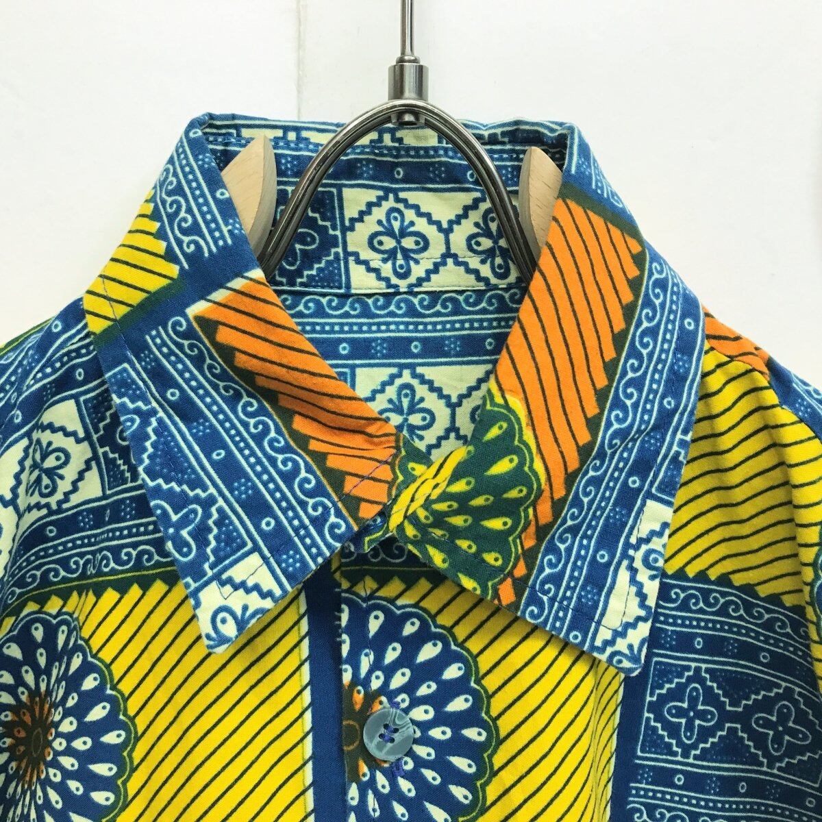 70〜 80年代あたり エスニック アフリカンプリントシャツ 民族柄 オレンジ・イエロー XXL 半袖