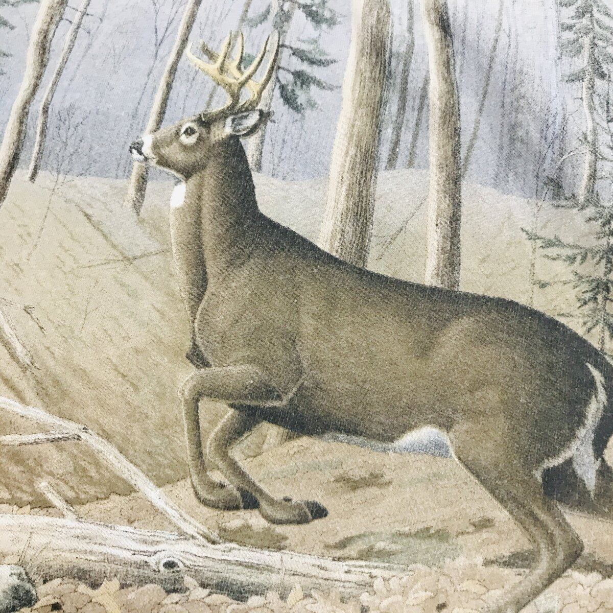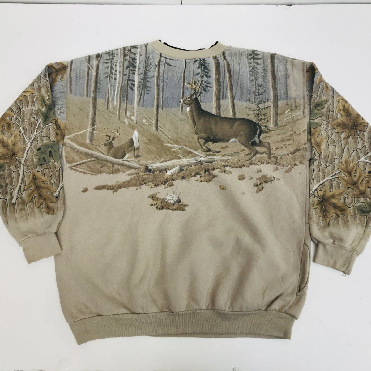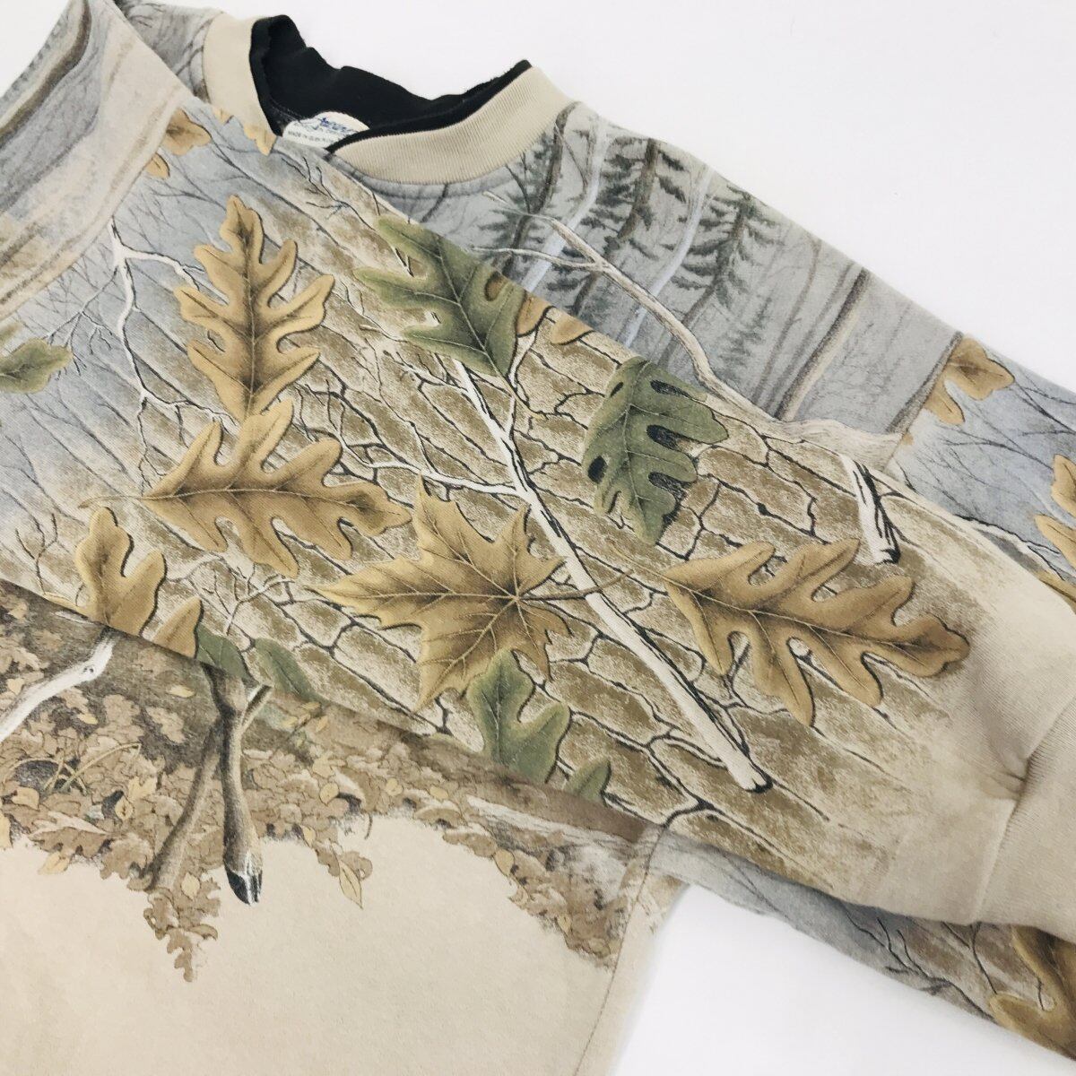ARTISANS SUNCHEIN DESIGNS 90年代 USA製 アニマルプリント 鹿 DEER リアルツリー柄 ヘンリーネック スウェット ベージュ XXL 長袖