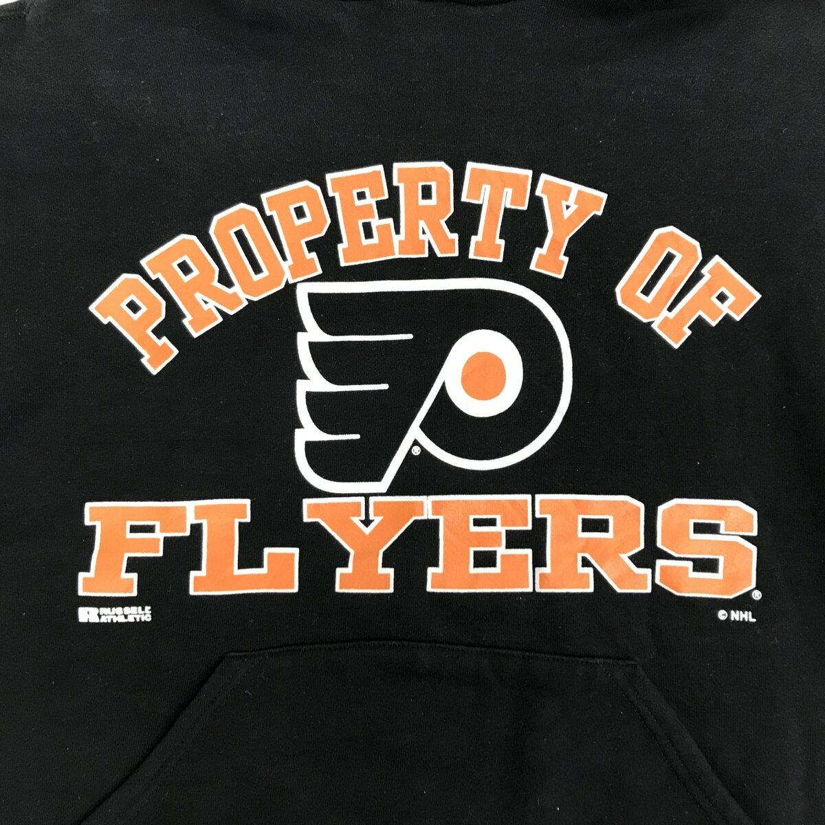 RUSSEL ラッセル 90年代 USA製 NHLフィラデルフィア フライヤーズ チームプリント スウェットパーカー フーディー ネイビー ML 長袖
