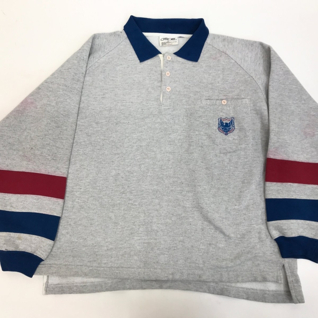 CHEROKEE チェロキー 80〜 90年代 ダメージ品 切り替え ボーダー ワンポイント 刺繍入り ポロシャツ ポロスウェット アッシュグレー XL 長袖