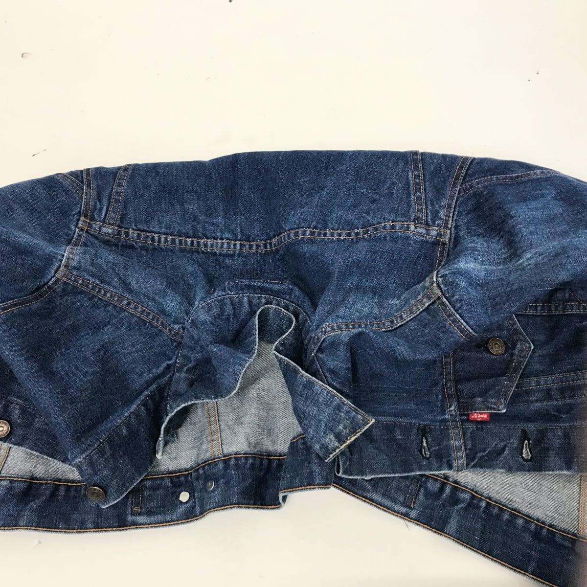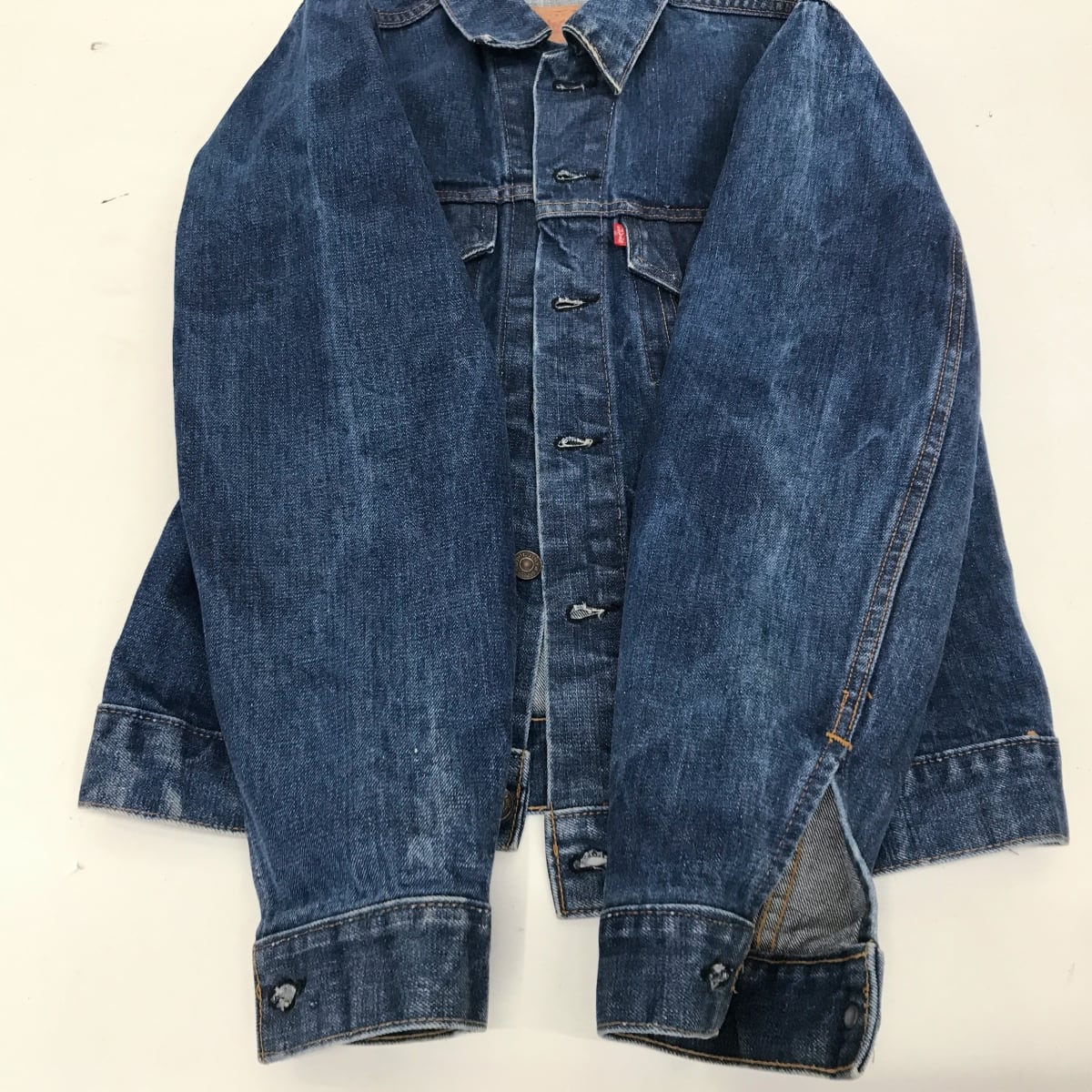 前後、特に袖に特殊な色落ちムラ?があります
